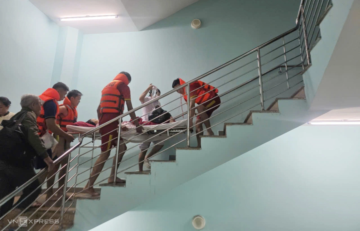 Bệnh nhân ở Bệnh viện Trung ương Huế được vận chuyển bằng cầu thang bộ, do điện lưới bị cắt.