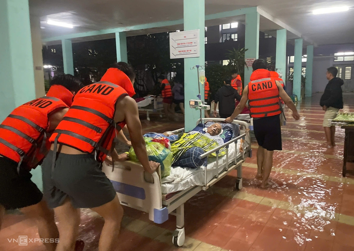 Bệnh viện Phục hồi chức năng trên đường Tô Hiến Thành, phường Phú Xuân, bị ngập sâu, đe dọa 29 bệnh nhân đang điều trị. Chiều 27/10, Chủ tịch TP Huế Phan Thiên Định có mặt tại hiện trường chỉ đạo công an, quân đội di dời bệnh nhân đến nơi cao ráo.