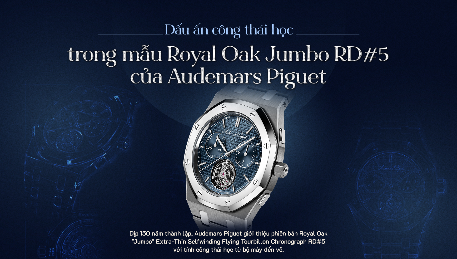 Để có được thiết kế mới, Royal Oak "Jumbo" Extra-Thin Flying Tourbillon Chronograph RD#5 kế thừa tinh thần tiên phong của dòng RD. Trong đó, phiên bản mới có flying tourbillon biên độ lớn, lần đầu tiên ra mắt trong RD#3 năm 2022. Cơ chế tự động này đã được tái thiết kế toàn diện nhằm giảm độ dày nhưng vẫn duy trì tỷ lệ cân đối nguyên bản.