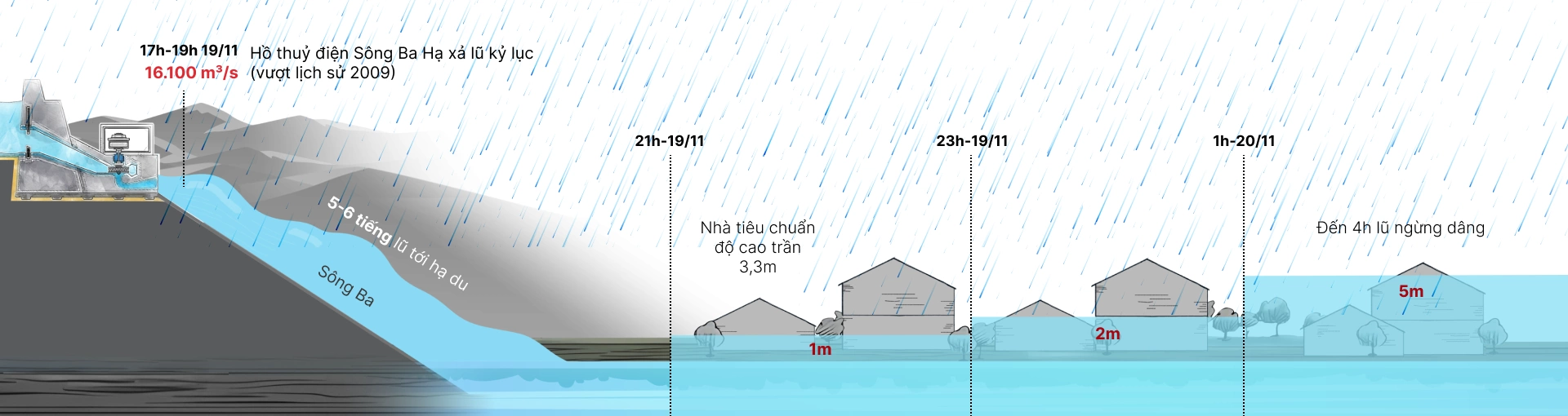 Từ 17h hôm đó, hồ thủy điện Sông Ba Hạ - "lá chắn" phòng lũ cuối cùng trên lưu vực Sông Ba - xả lũ lịch sử 16.100 m3/s, kéo dài liên tục đến 19h mới giảm. Mất khoảng 5-6 tiếng, lũ truyền đến hạ du.