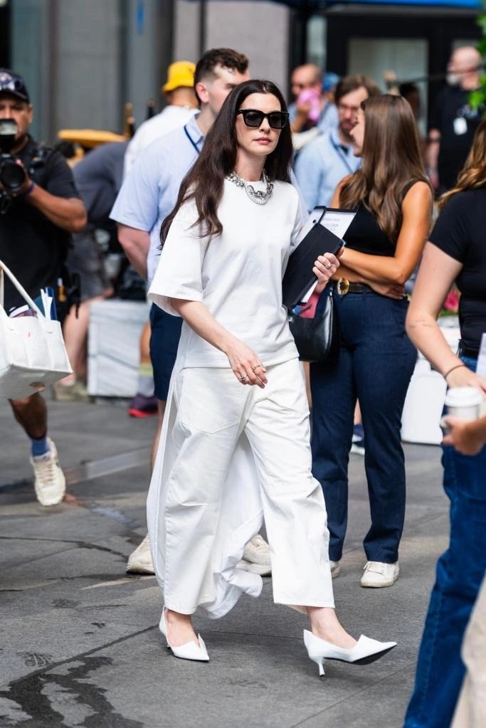 Anne Hathaway toát lên vẻ ngầu trong bộ áo liền quần Re/Done x Ford lấy cảm hứng từ bảo hộ lao động, sandals Chanel, túi Valentino và kính râm Celine.