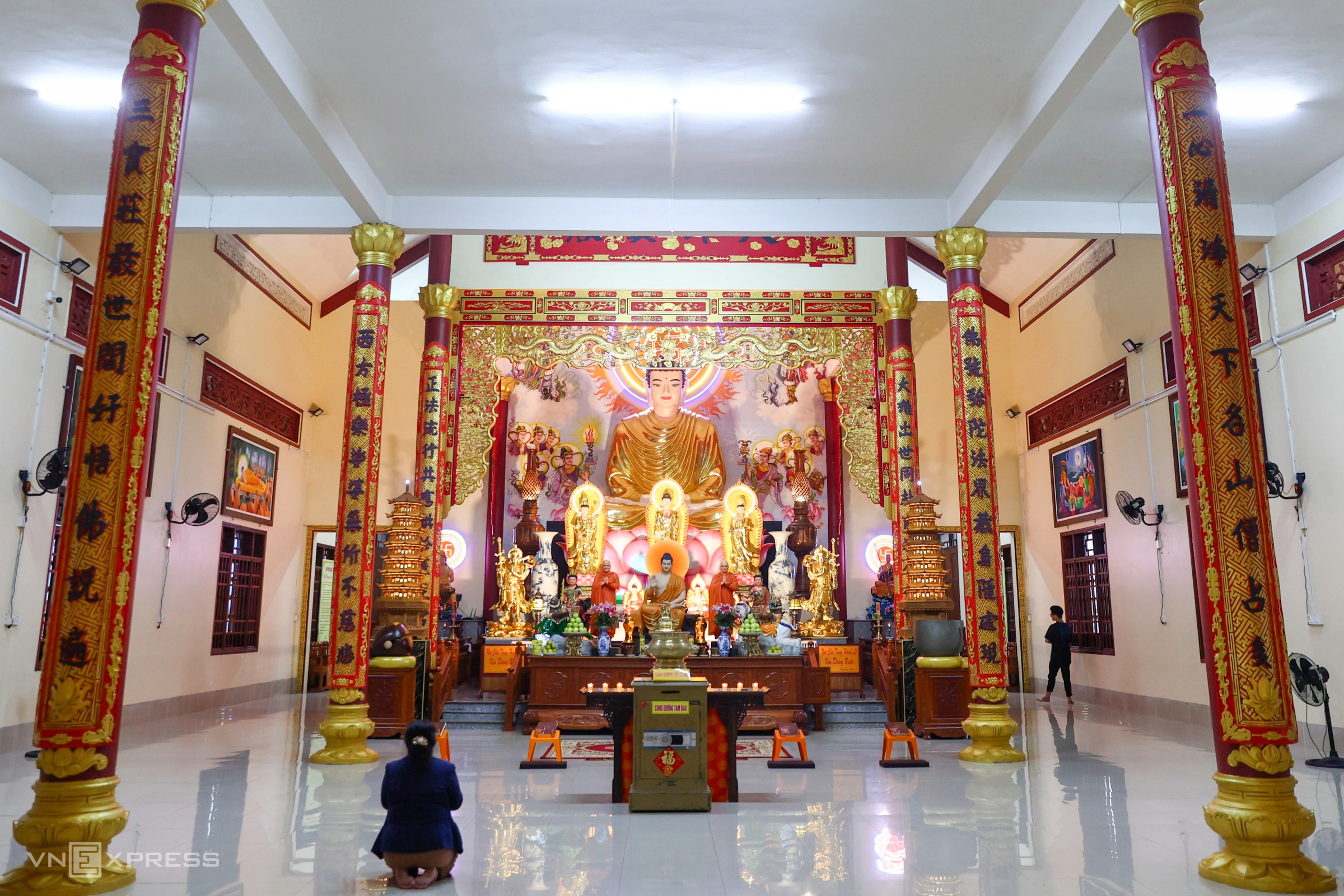 Người dân hành lễ trong các gian thờ Phật, bên ngoài là khoảng sân ngập nước.