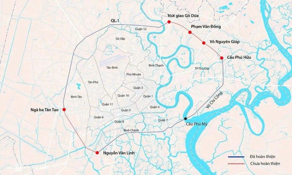 Vành đai 2 là tuyến đô thị bao quanh TP HCM, còn gần 14 km chưa khép kín, chia thành bốn dự án tổng vốn gần 16.000 tỷ đồng. Trong đó, đoạn 1 dài 3,5 km (cầu Phú Hữu – Võ Nguyên Giáp) dự kiến khởi công trước 15/11; đoạn 4 dài 5,3 km (quốc lộ 1A – Nguyễn Văn Linh) đang nghiên cứu đầu tư công.