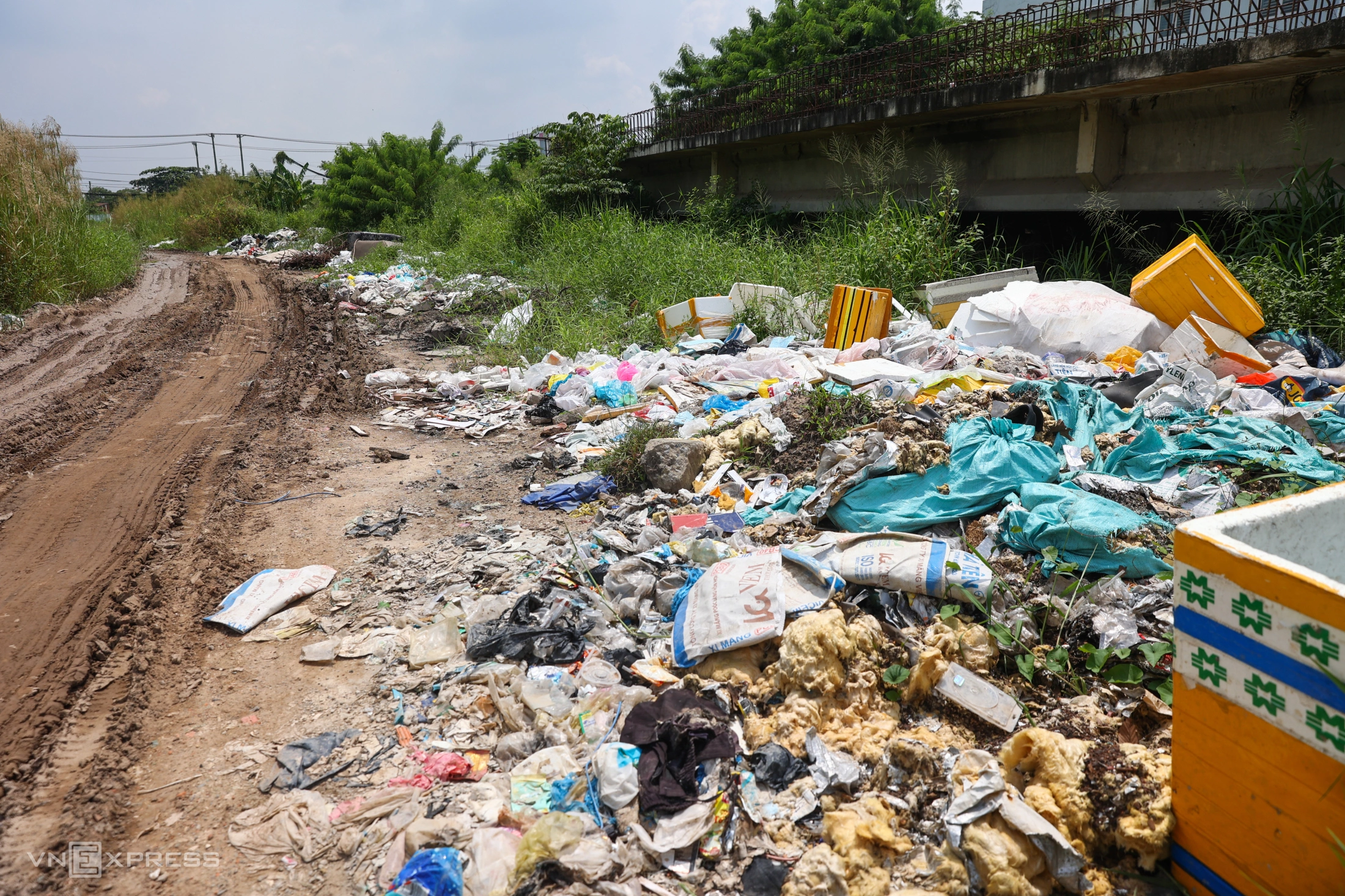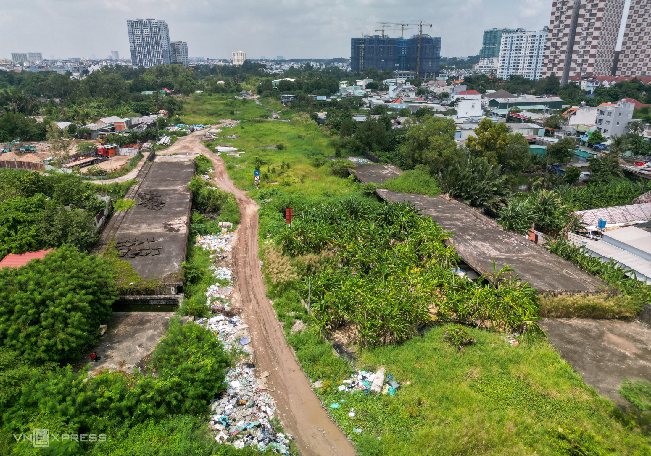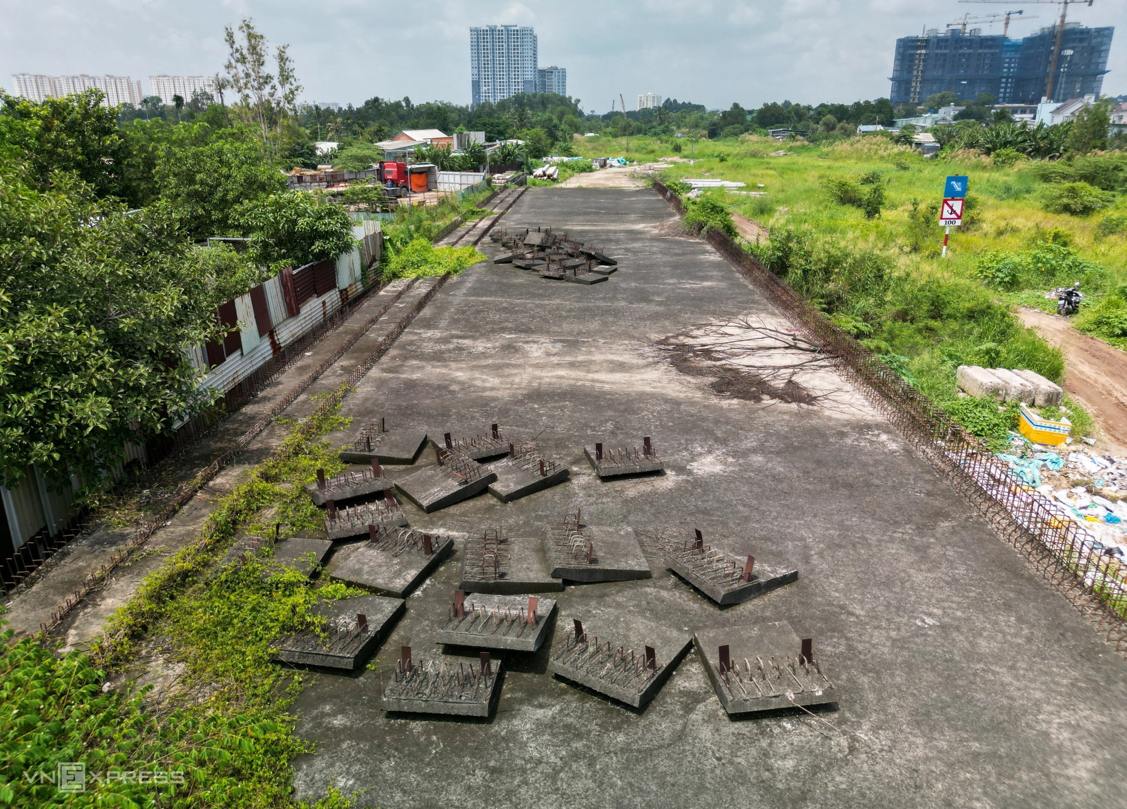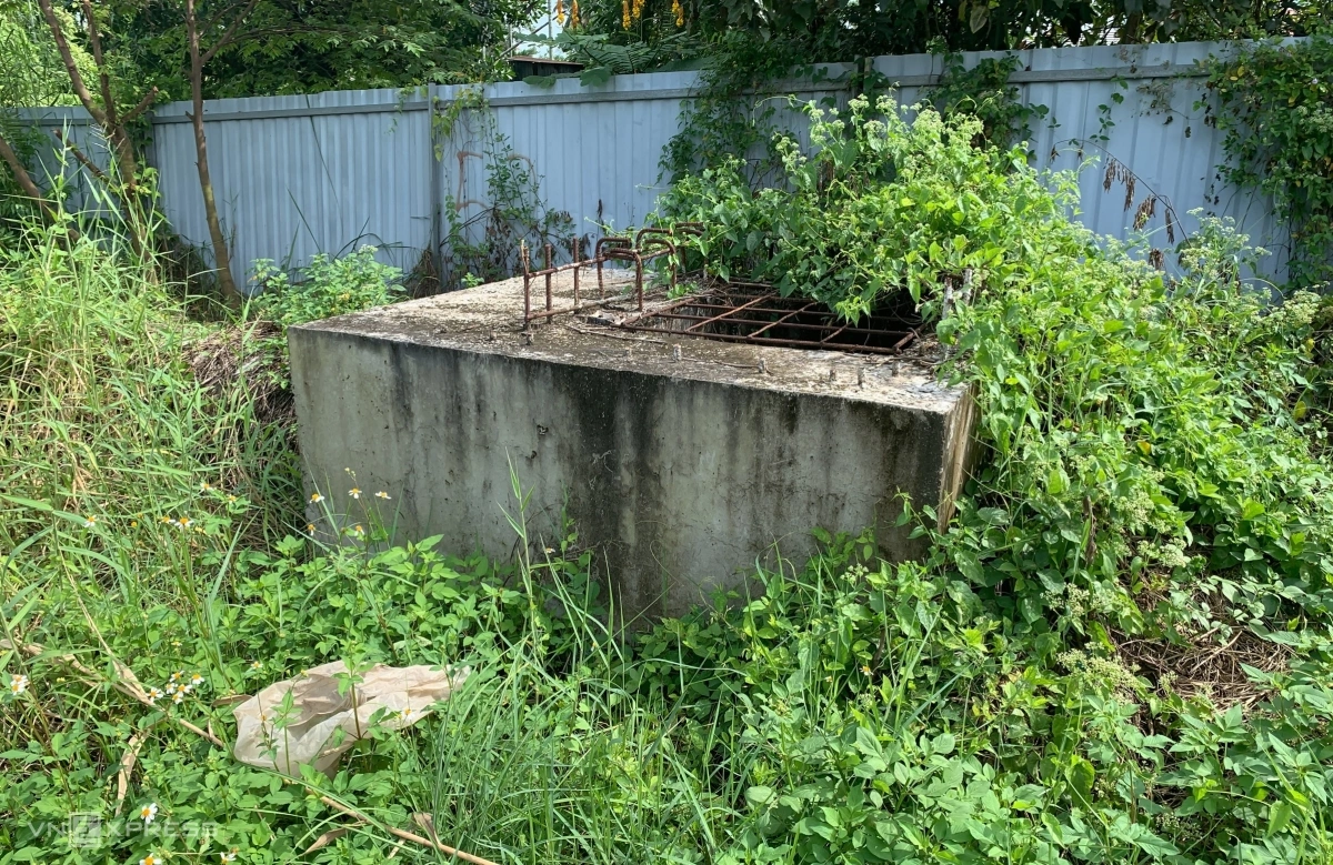 Trên công trường, rất nhiều loại lật liệu xây dựng ngổn ngang trong các bụi cỏ, bãi rác.