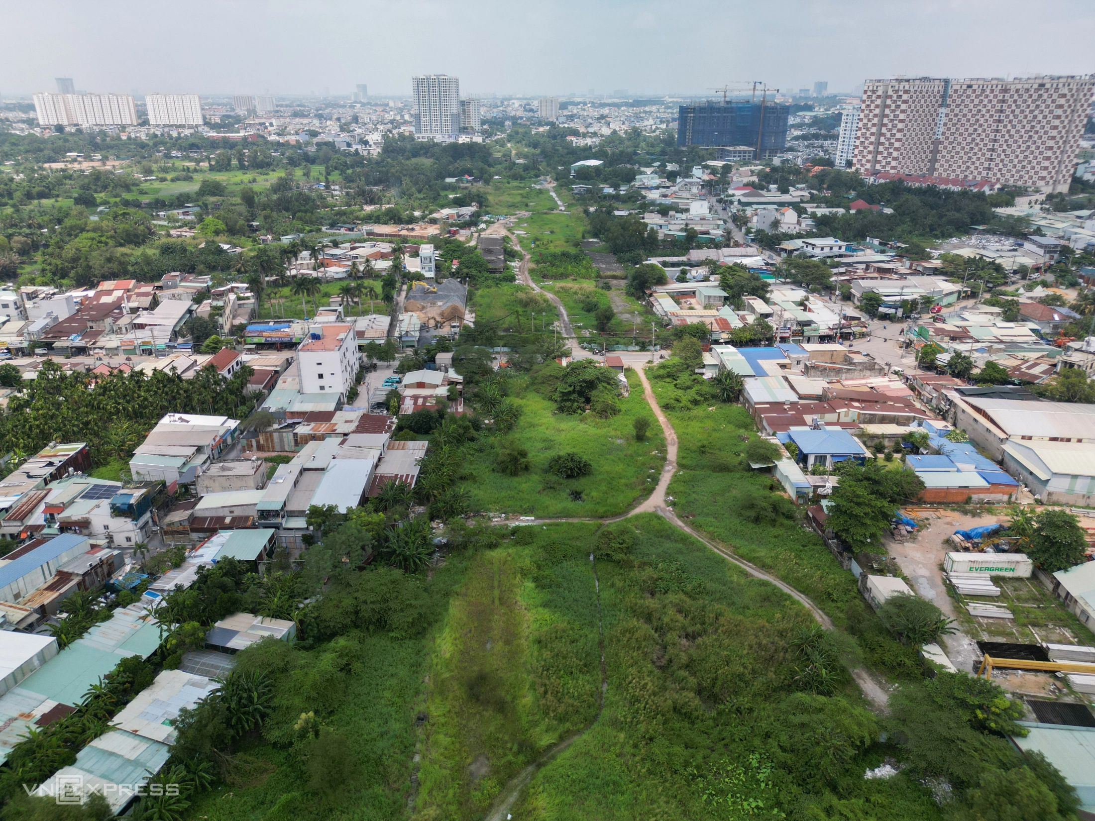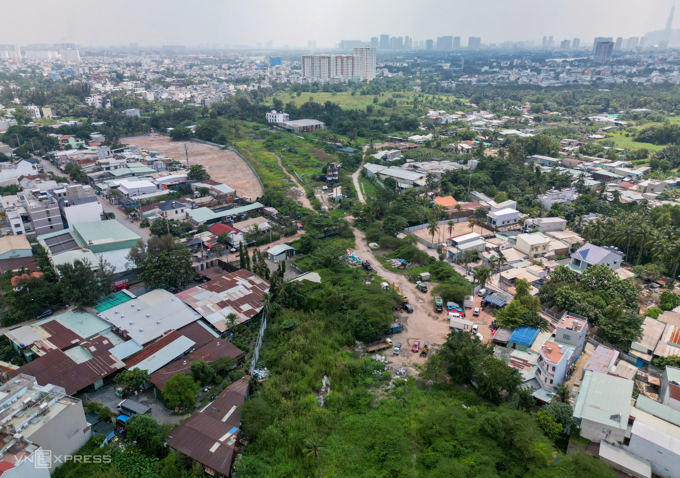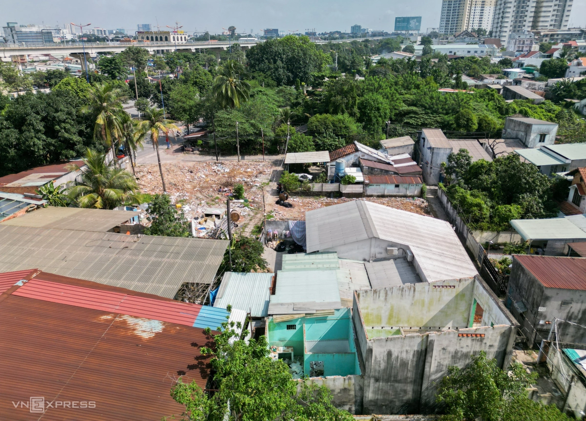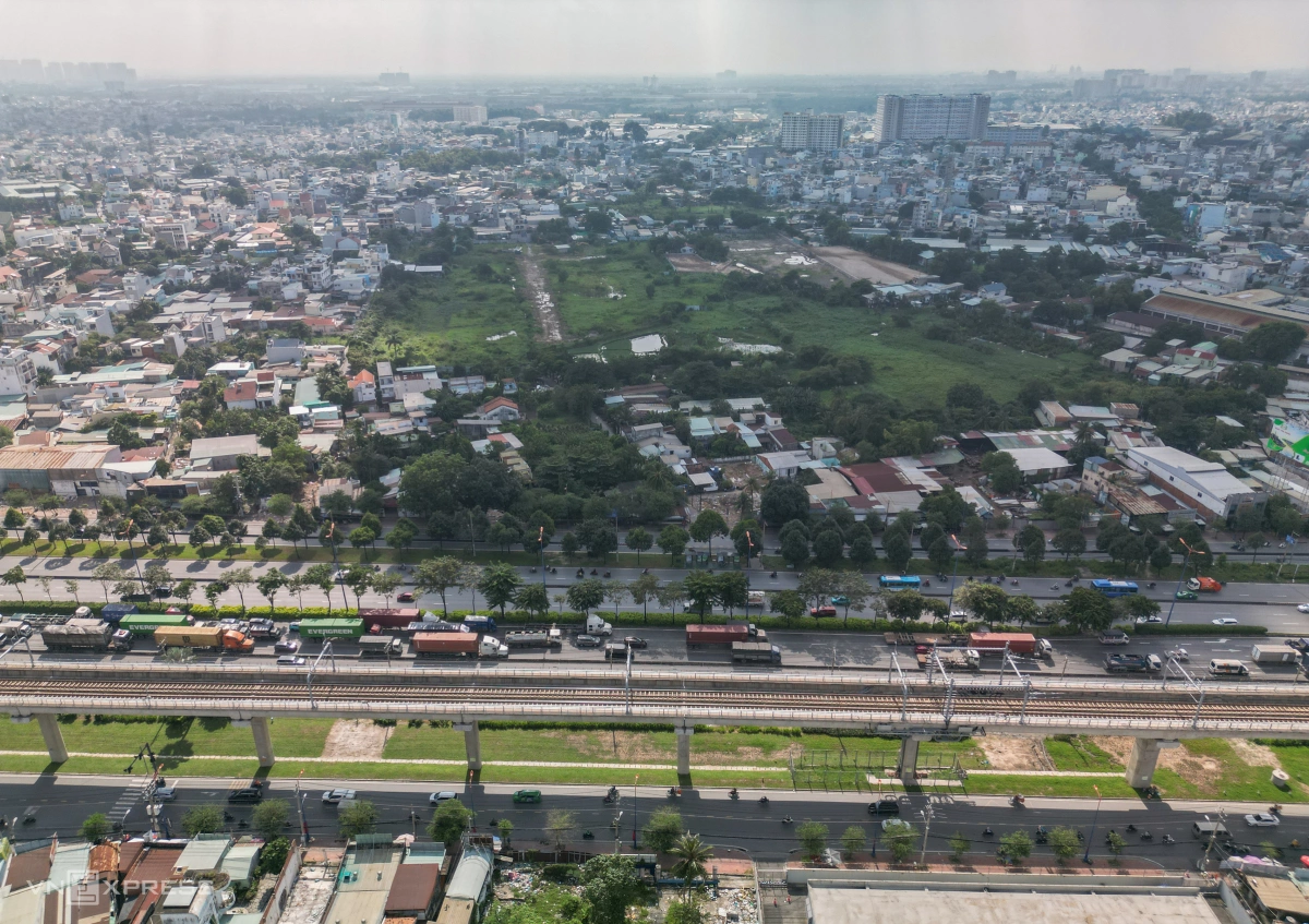 Từ trên cao, đoạn 2 hướng từ đường Võ Nguyên Giáp đến Phạm Văn Đồng còn nhiều mặt bằng chưa bàn giao.