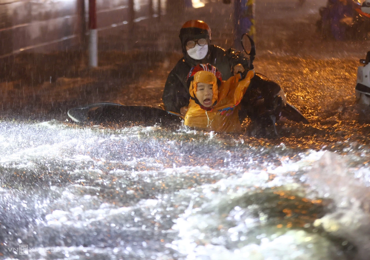 Tại một số nơi ngập sâu, ôtô chạy qua lại tạo nhiều đợt sóng mạnh quật ngã người đi xe máy. Hai mẹ con bị sóng đánh trôi về phía vỉa hè trên đường Đỗ Xuân Hợp.