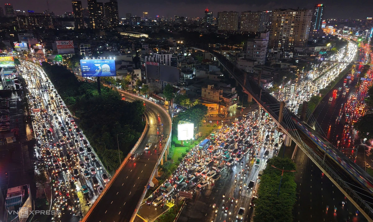 Đường Nguyễn Hữu Cảnh từ cầu vượt Văn Thánh 2 ùn tắc kéo dài 2 km đến nhà ga Tân Cảng. Đây là tuyến đường huyết mạch vào trung tâm thành phố, luôn có mật độ xe đông đúc cộng thêm mưa lớn khiến tình trạng ùn tắc thêm trầm trọng.