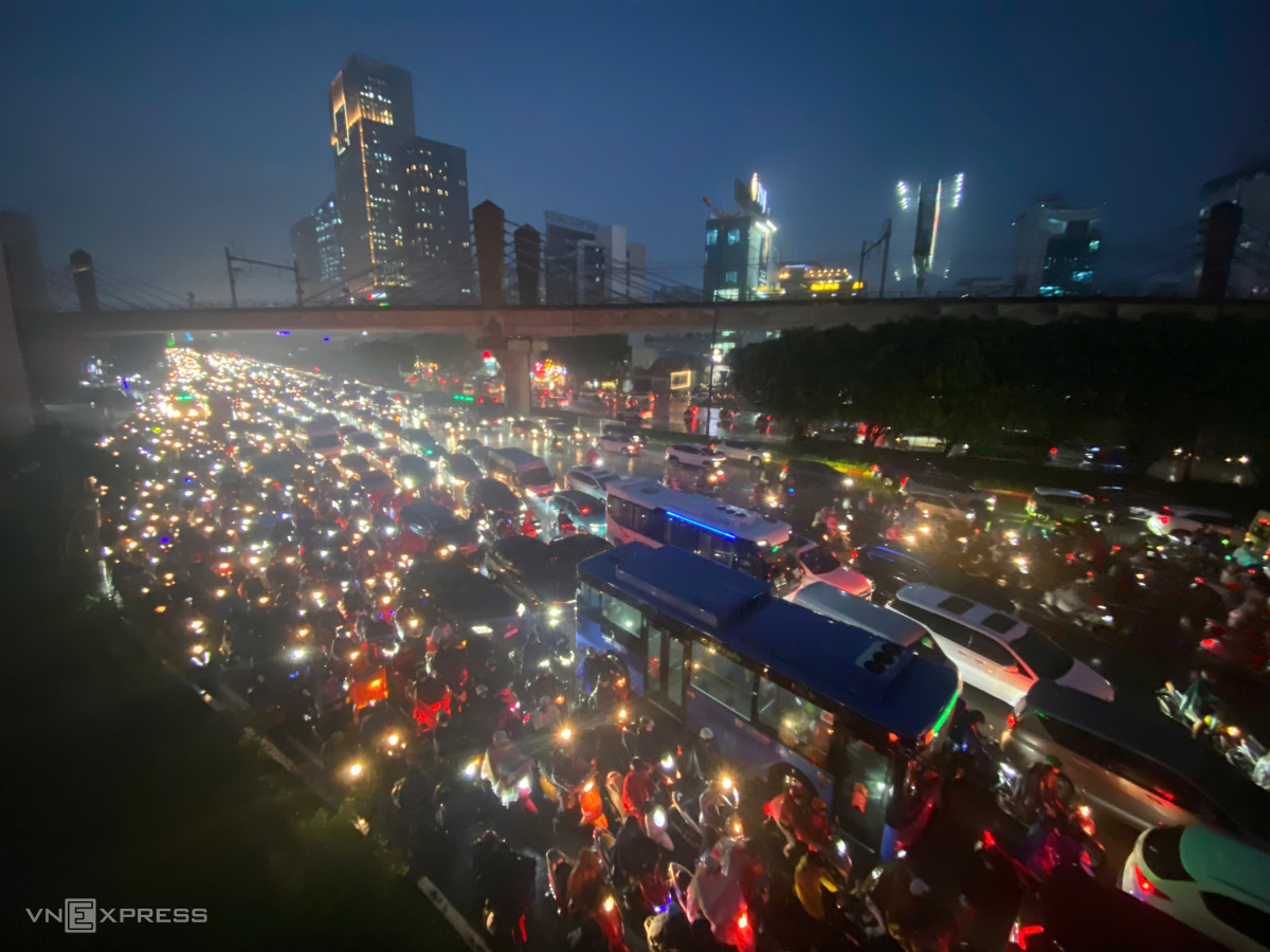 Lúc 18h30, đường Nguyễn Hữu Cảnh và Điện Biên Phủ đoạn dưới ga metro Tân Cảng (quận Bình Thạnh cũ) dẫn lên cầu Sài Gòn ken đặc phương tiện. Xe máy, ôtô nhích từng chút để di chuyển.