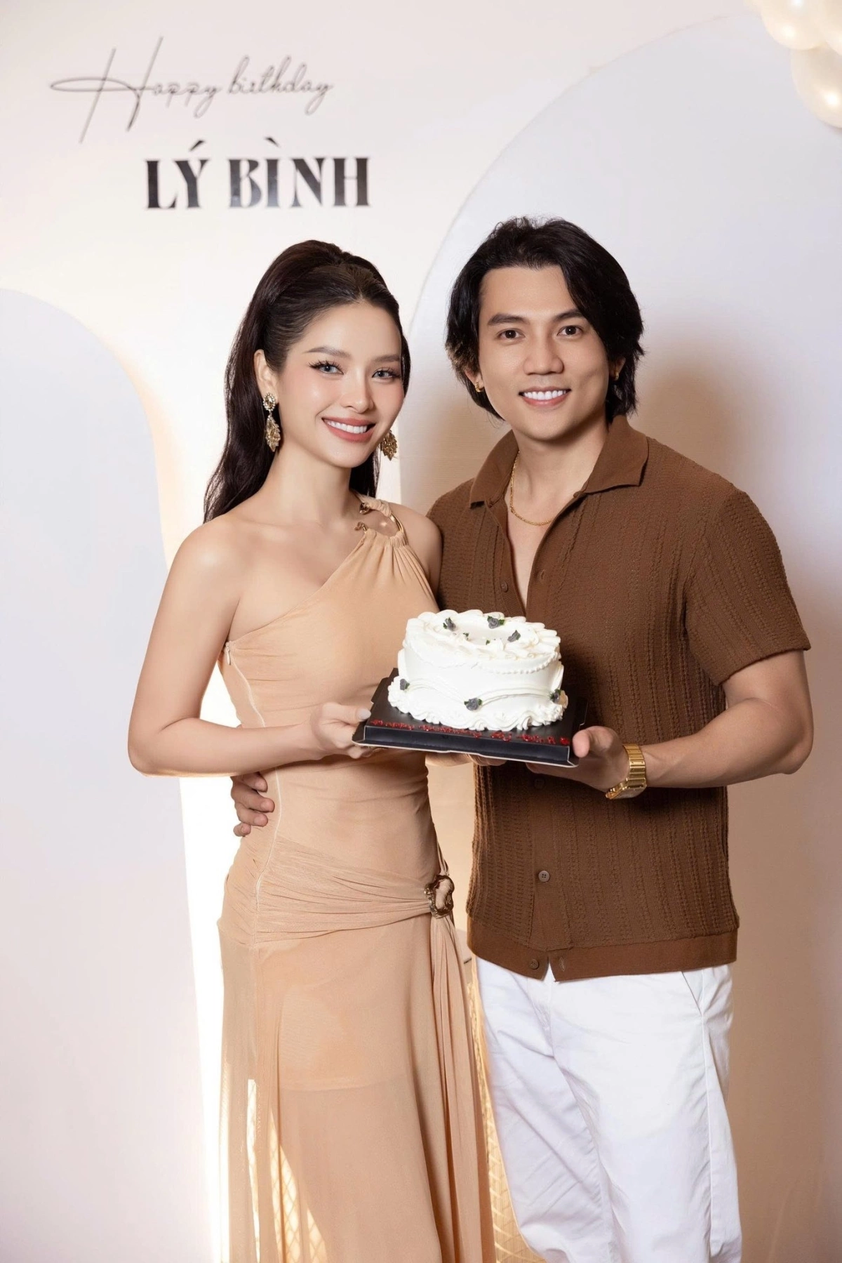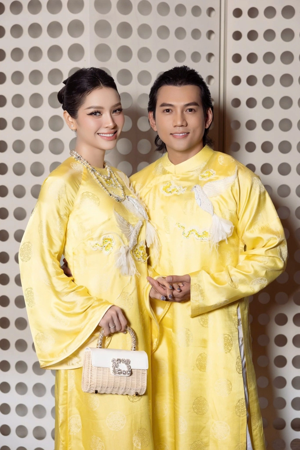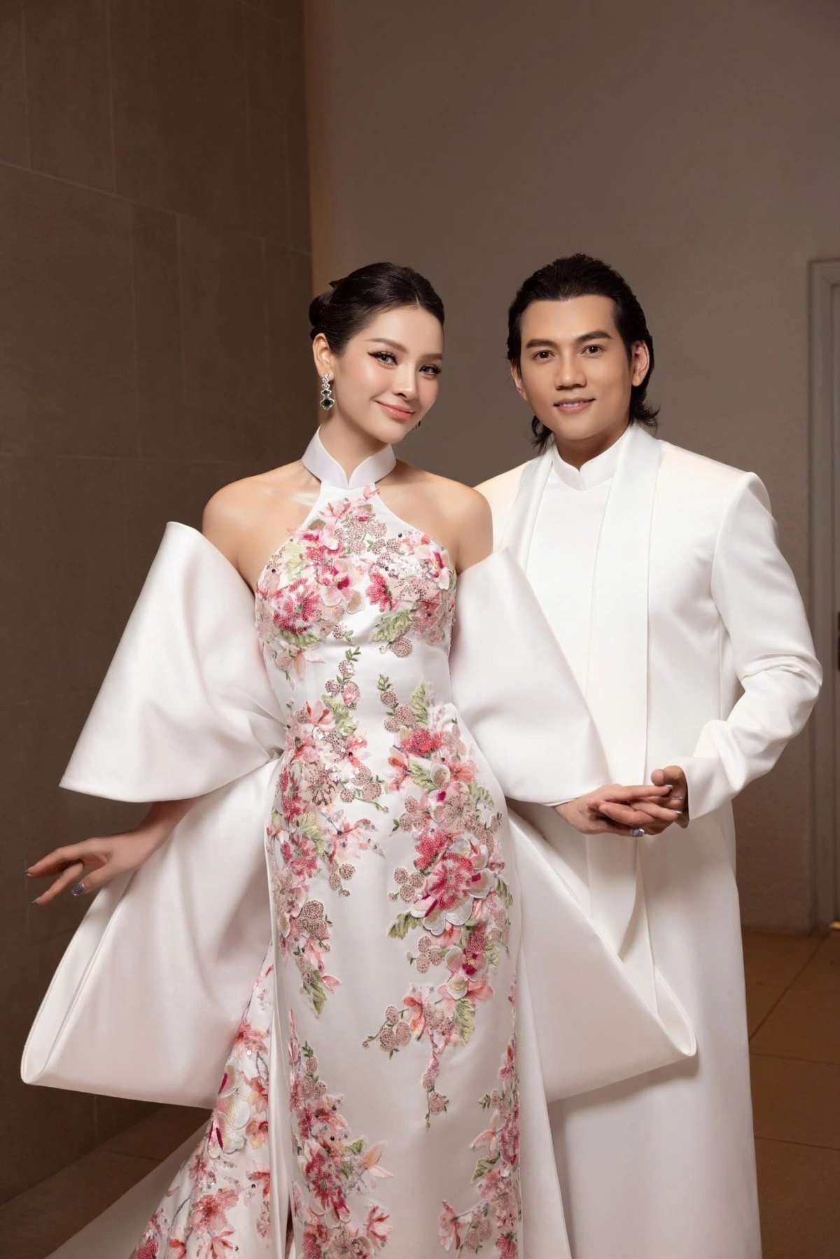 Xuất hiện trong một sự kiện hôm 30/9, đôi uyên ương thu hút sự chú ý trong những bộ đồ màu trắng chủ đạo, pha trộn phong cách Á đông và phương Tây. Jolie Phương Trinh diện áo dài cách tân cổ yếm thêu hoa, sau lưng nhấn bằng nơ khổng lồ. Lý Bình chọn áo dài lụa đơn sắc.