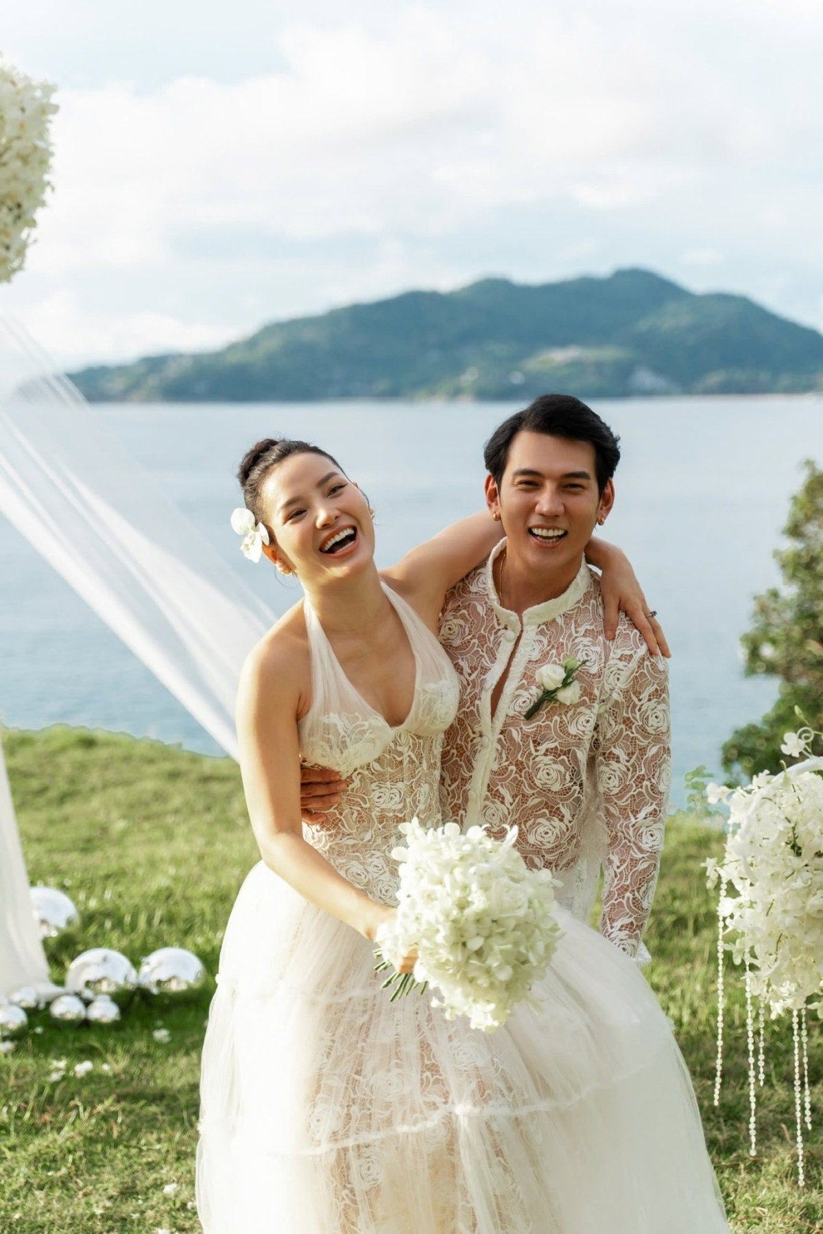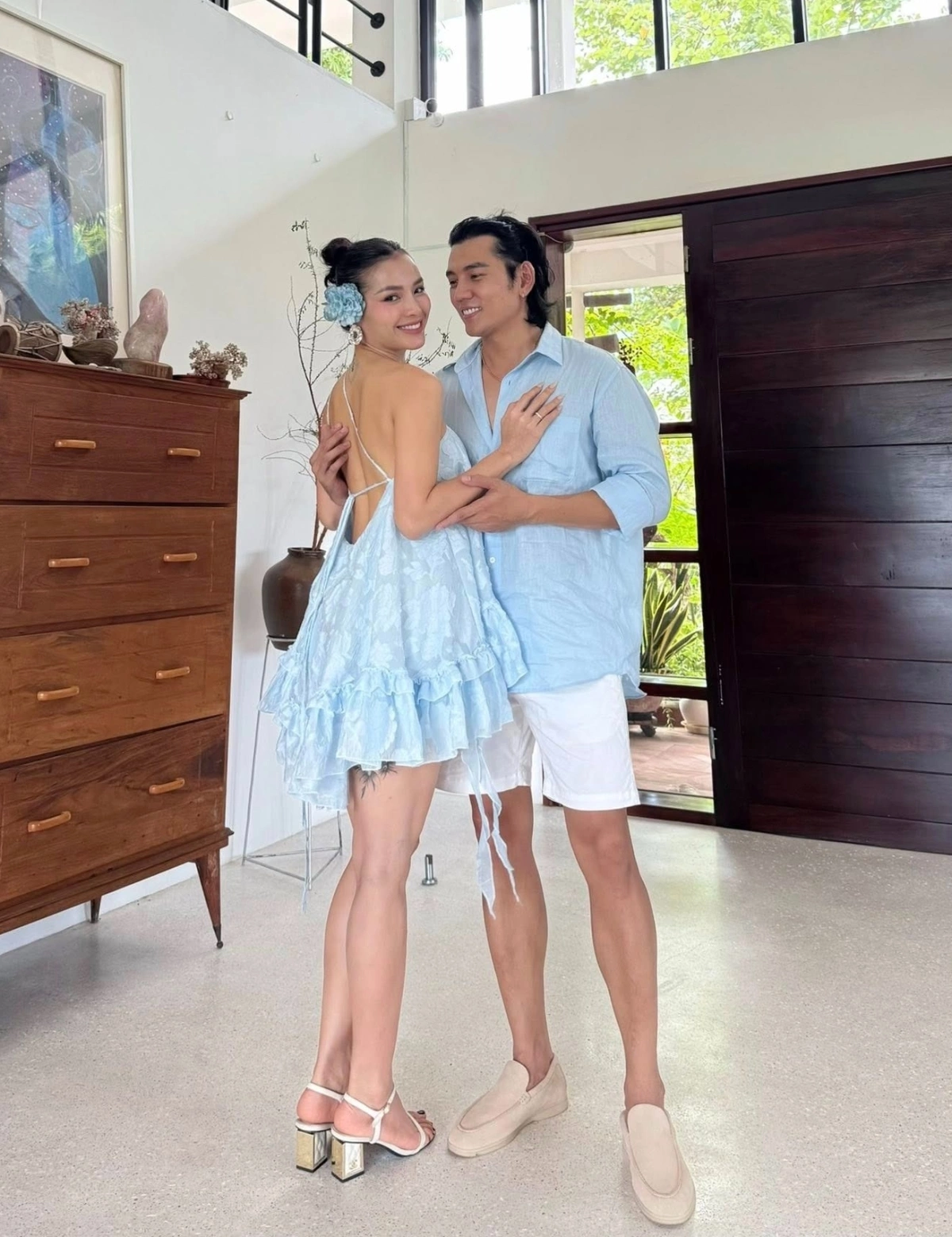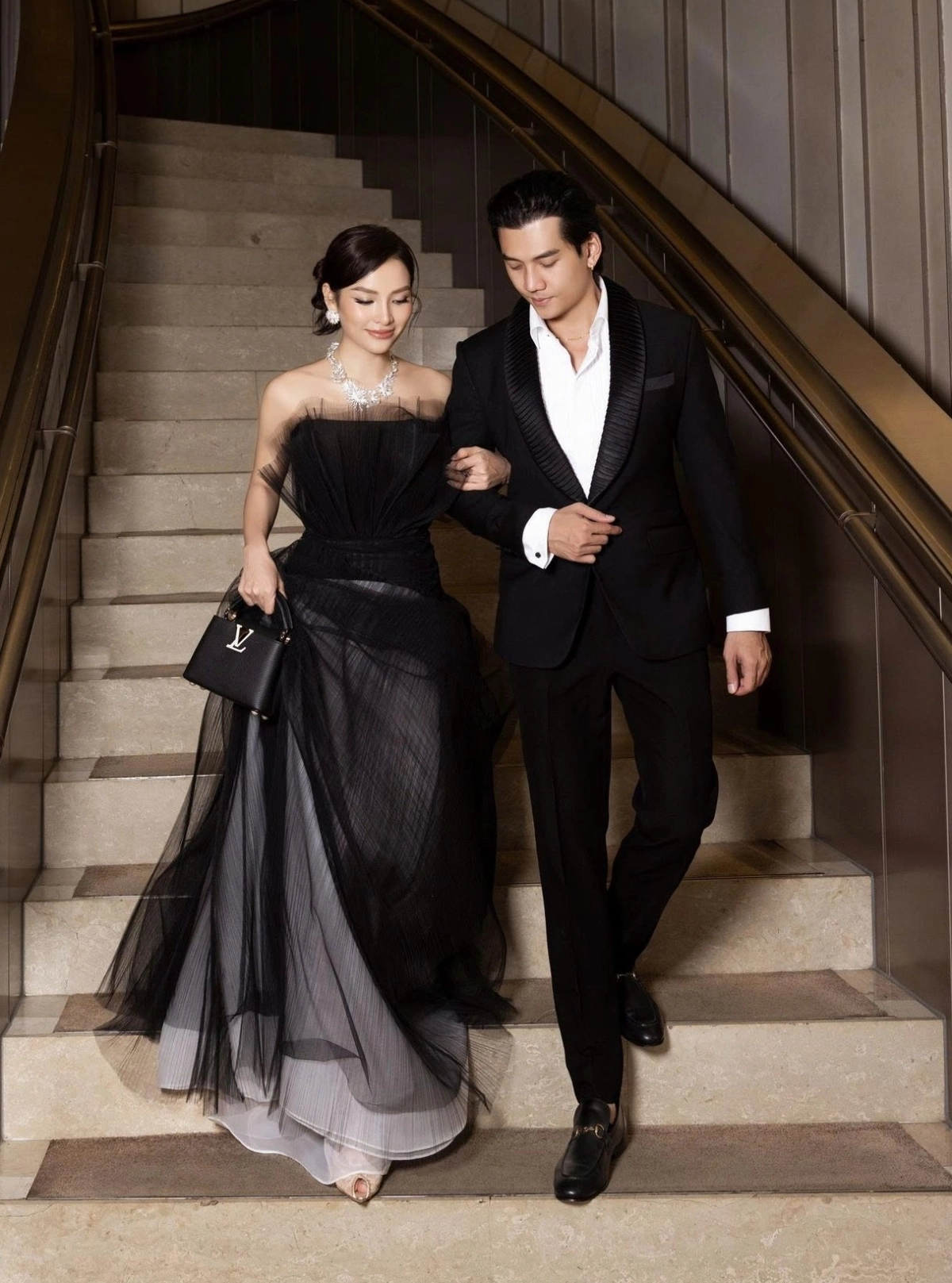 Xuất hiện trong một sự kiện hôm 30/9, đôi uyên ương thu hút sự chú ý trong những bộ đồ màu trắng chủ đạo, pha trộn phong cách Á đông và phương Tây. Jolie Phương Trinh diện áo dài cách tân cổ yếm thêu hoa, sau lưng nhấn bằng nơ khổng lồ. Lý Bình chọn áo dài lụa đơn sắc.