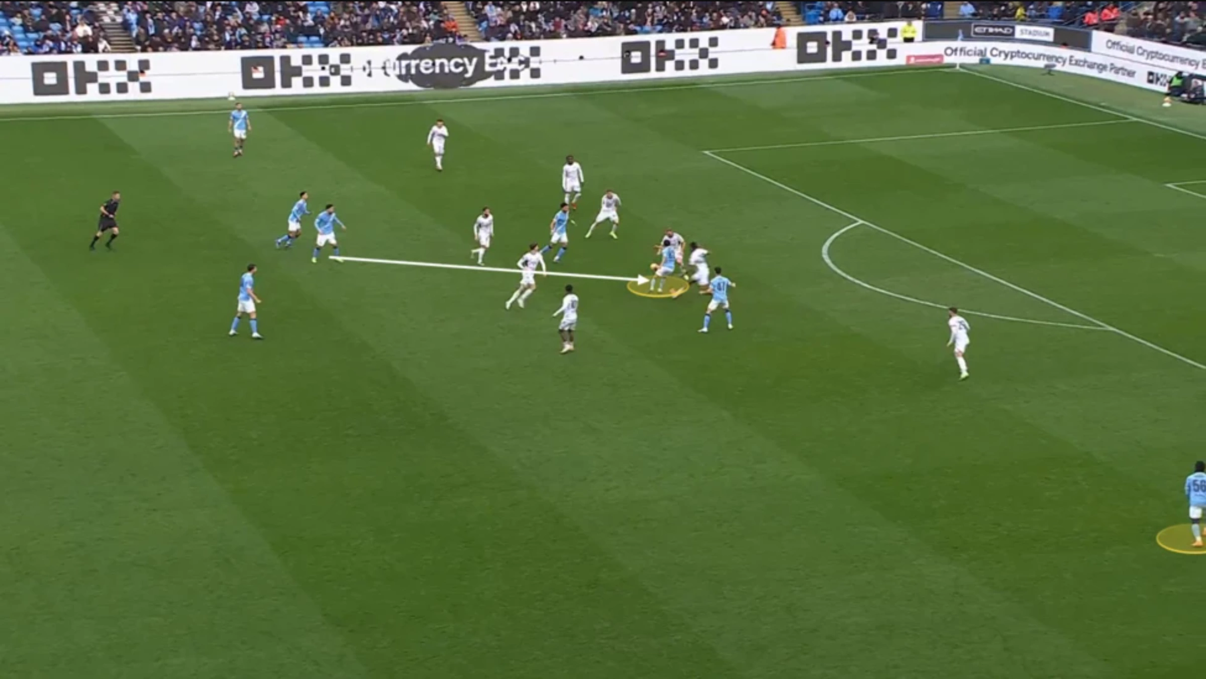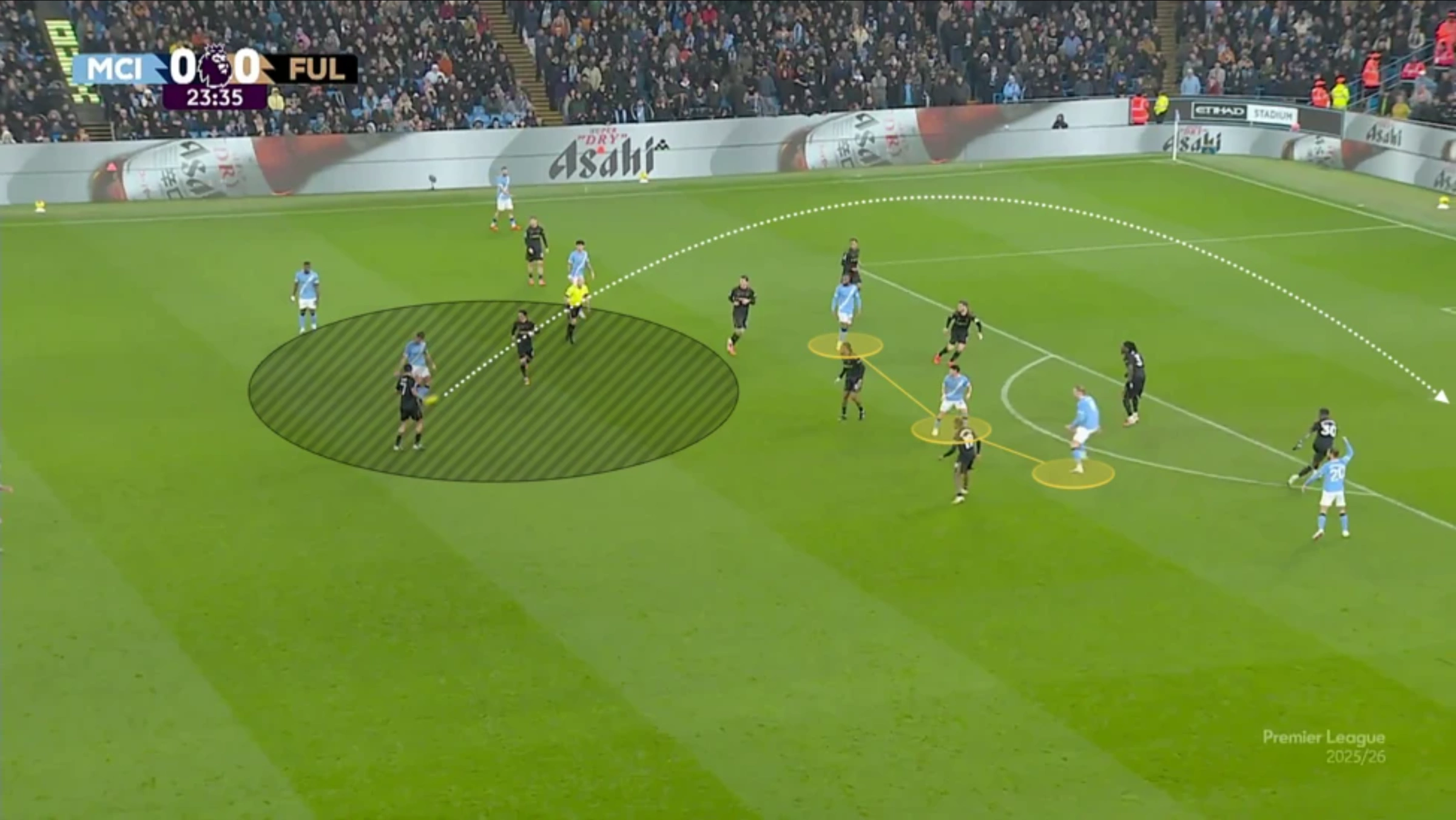 Đầu mùa 2025-2026, Man City đã tận dụng tối đa khả năng phản công của những cá nhân như Erling Haaland và Tijjani Reijnders. Đến tháng 11, số bàn thắng từ các tình huống chuyển trạng thái nhanh của họ đã nhiều hơn tổng cộng hai mùa trước đó cộng lại. Để đối phó với những hàng thủ chơi ngày càng cơ bắp và bó chặt vào trung lộ ở Ngoại hạng Anh, Man City đã ghi bàn bằng cách trực tiếp băng qua các khối phòng ngự lùi sâu này.