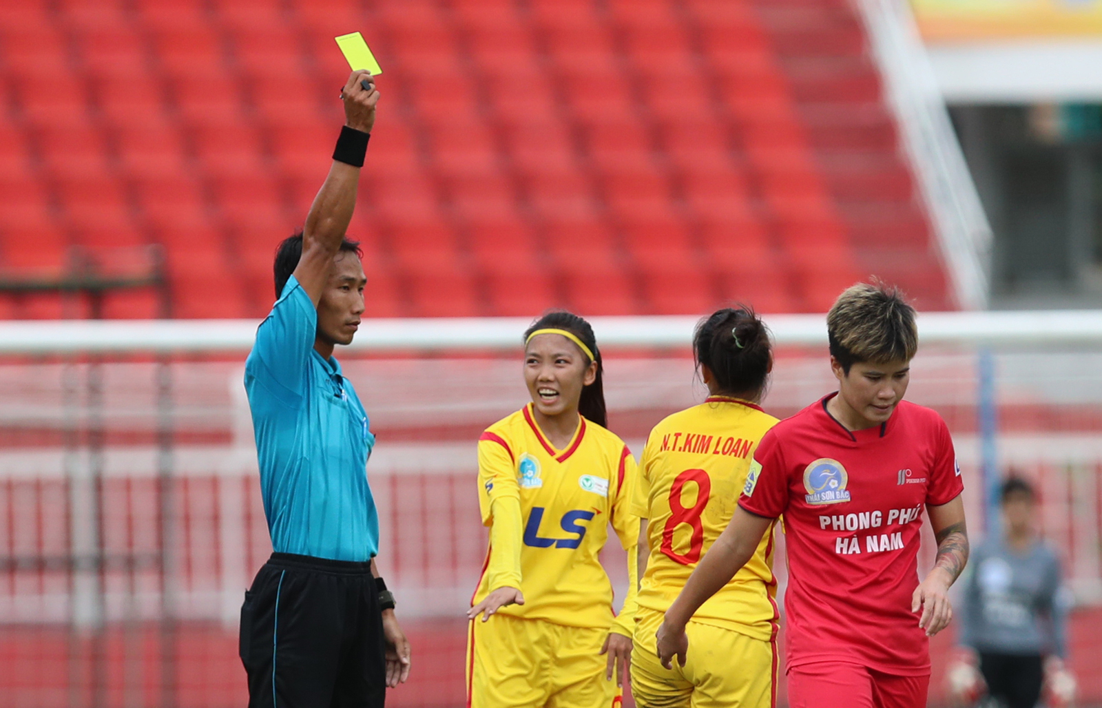 Ức chế khi đối phương câu giờ lộ liễu, tiền đạo Huỳnh Như của TP HCM I nhiều lần lại gần mắng mỏ và bị trọng tài rút thẻ vàng.
