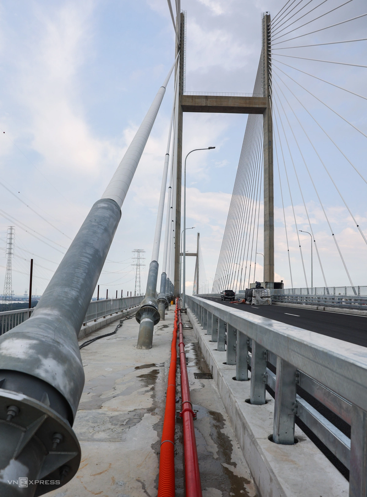 Lan can cầu cao khoảng một mét bằng kết cấu thép, ở giữa là hệ thống phòng cháy chữa cháy đang hoàn thiện.