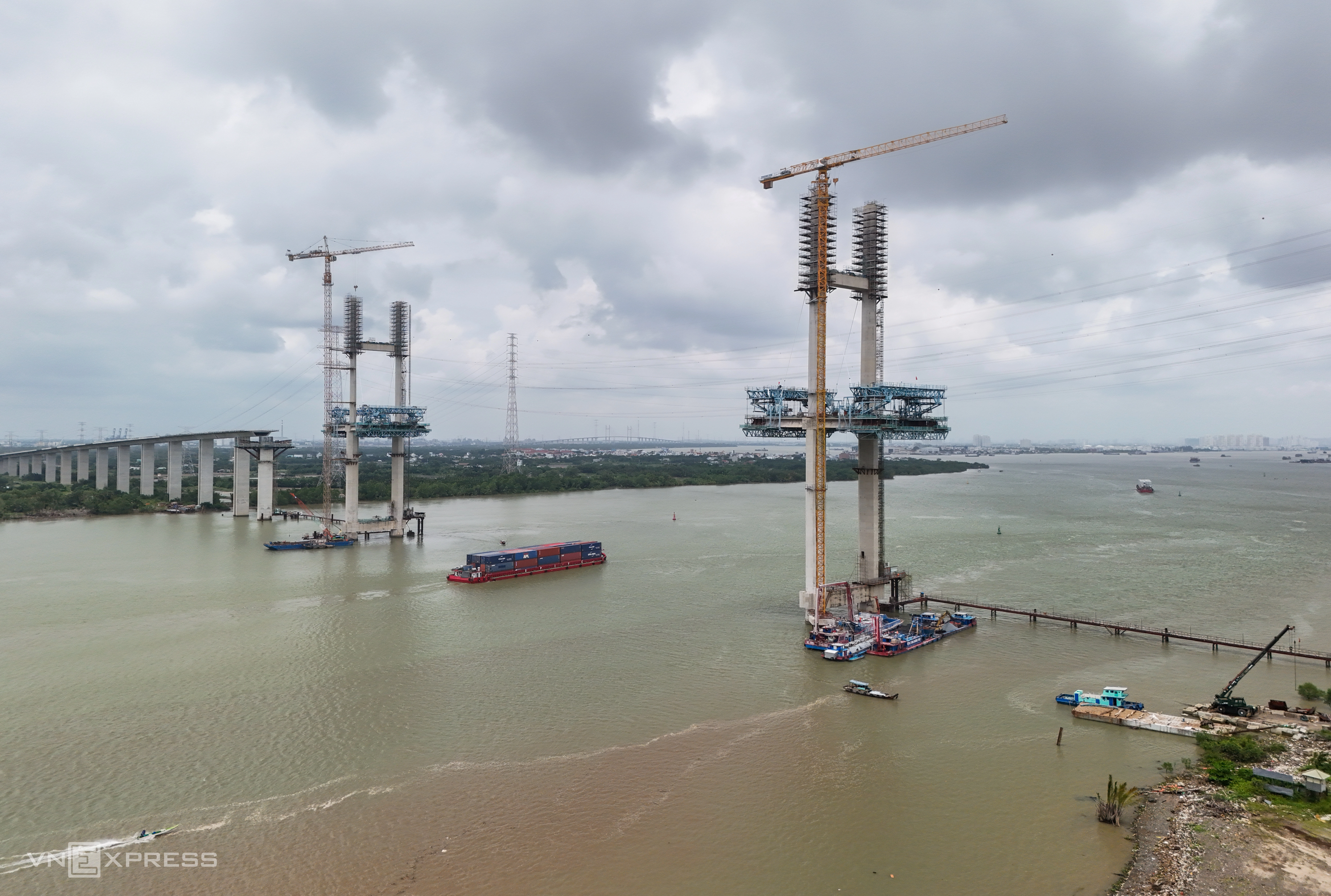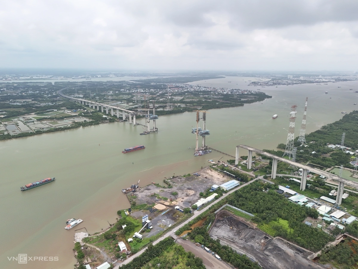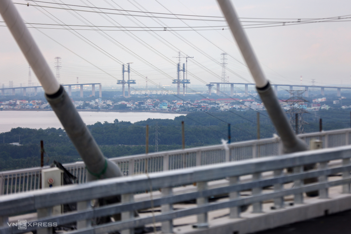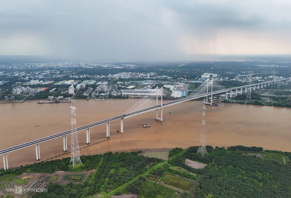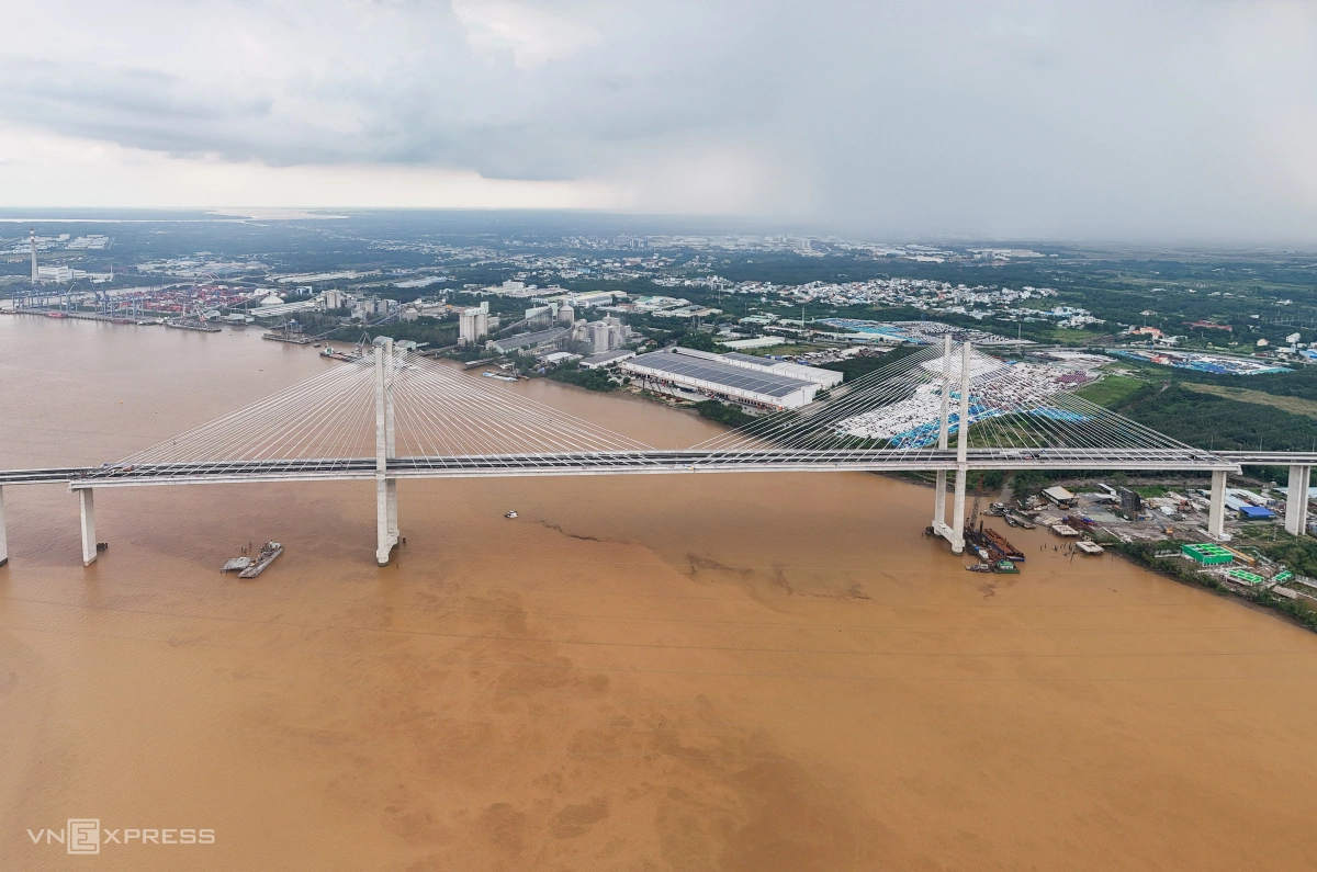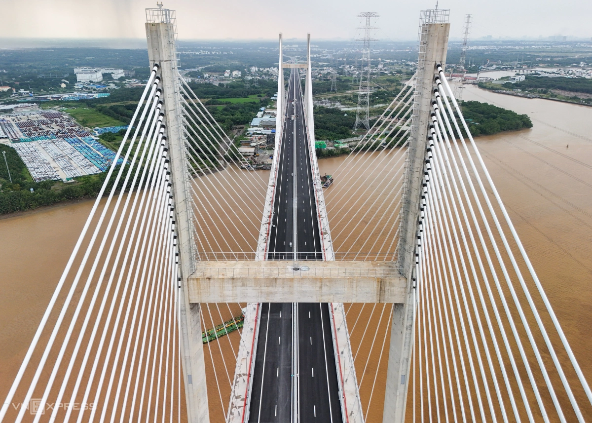 Cầu Bình Khánh trên cao tốc Bến Lức - Long Thành cơ bản hoàn thành sau 10 năm, nối Nhà Bè và Cần Giờ qua sông Soài Rạp, vốn hơn 2.800 tỷ đồng. Công trình từng dừng thi công từ 2018, khởi động lại tháng 10/2023.