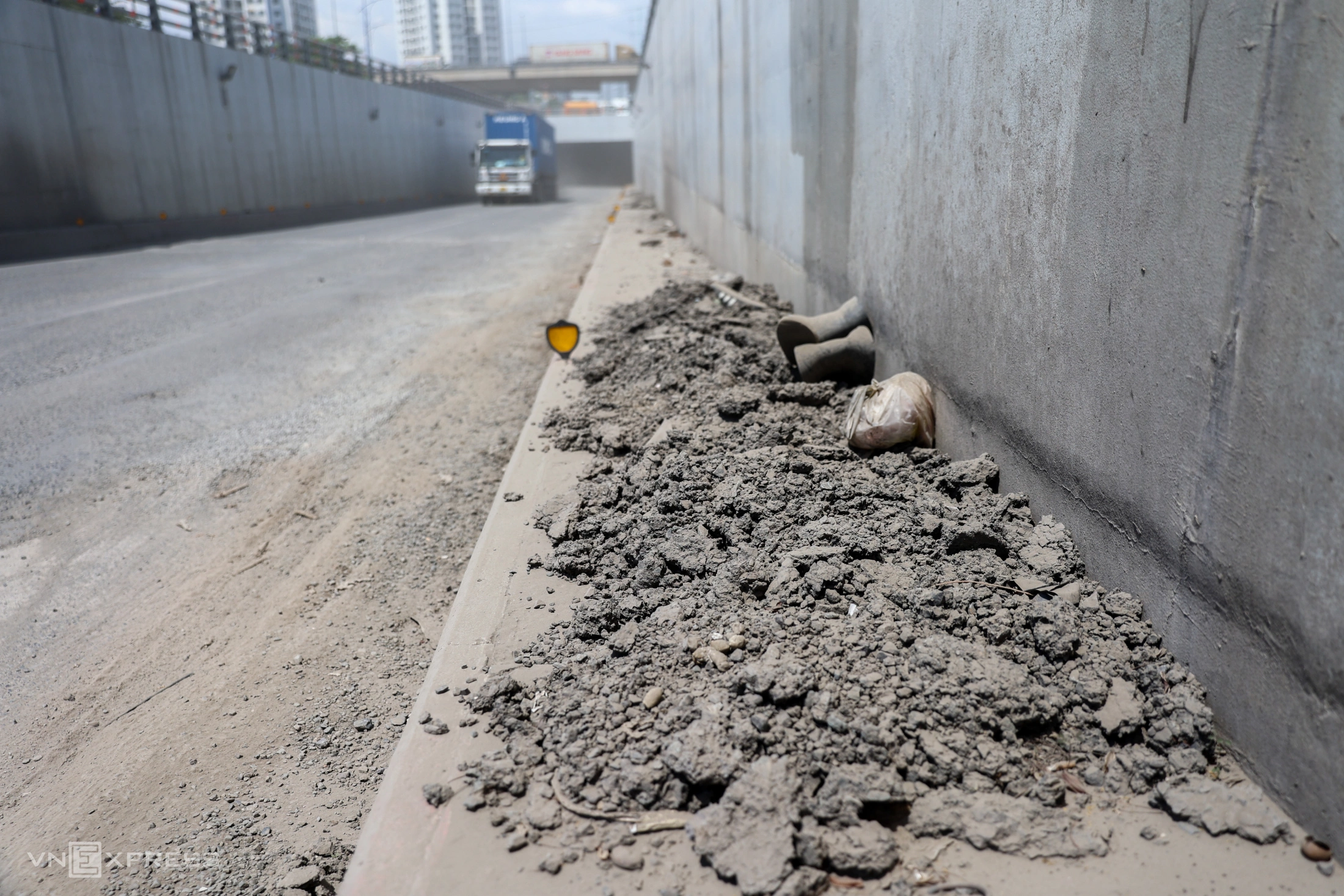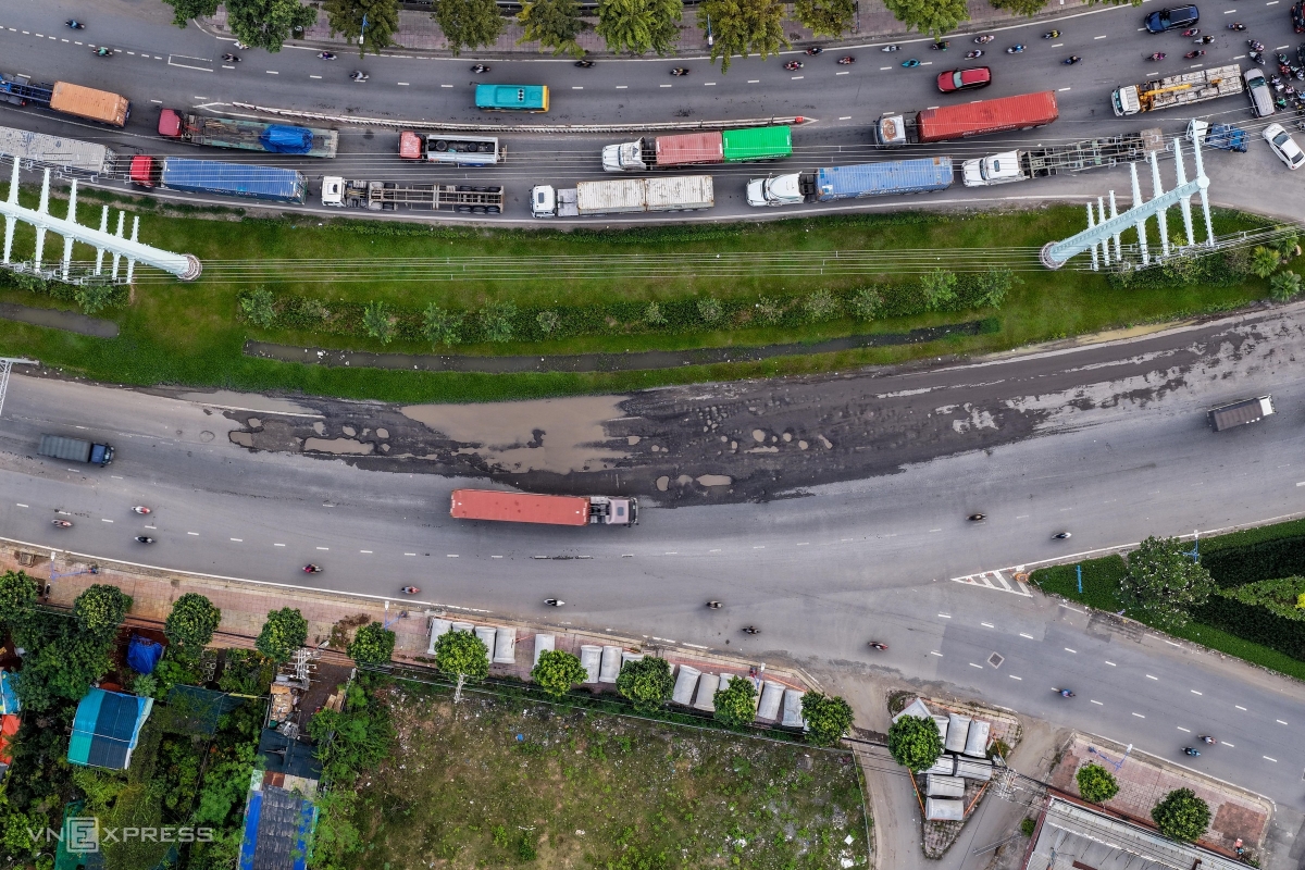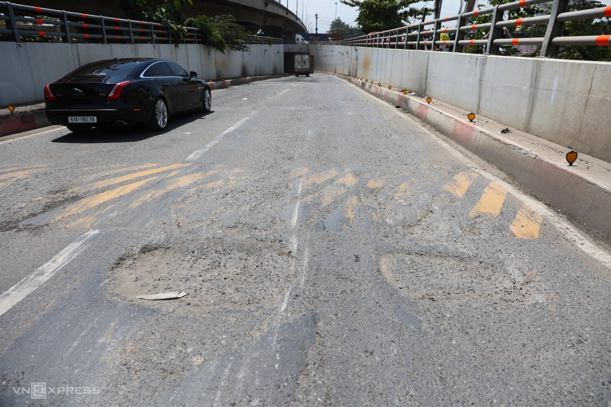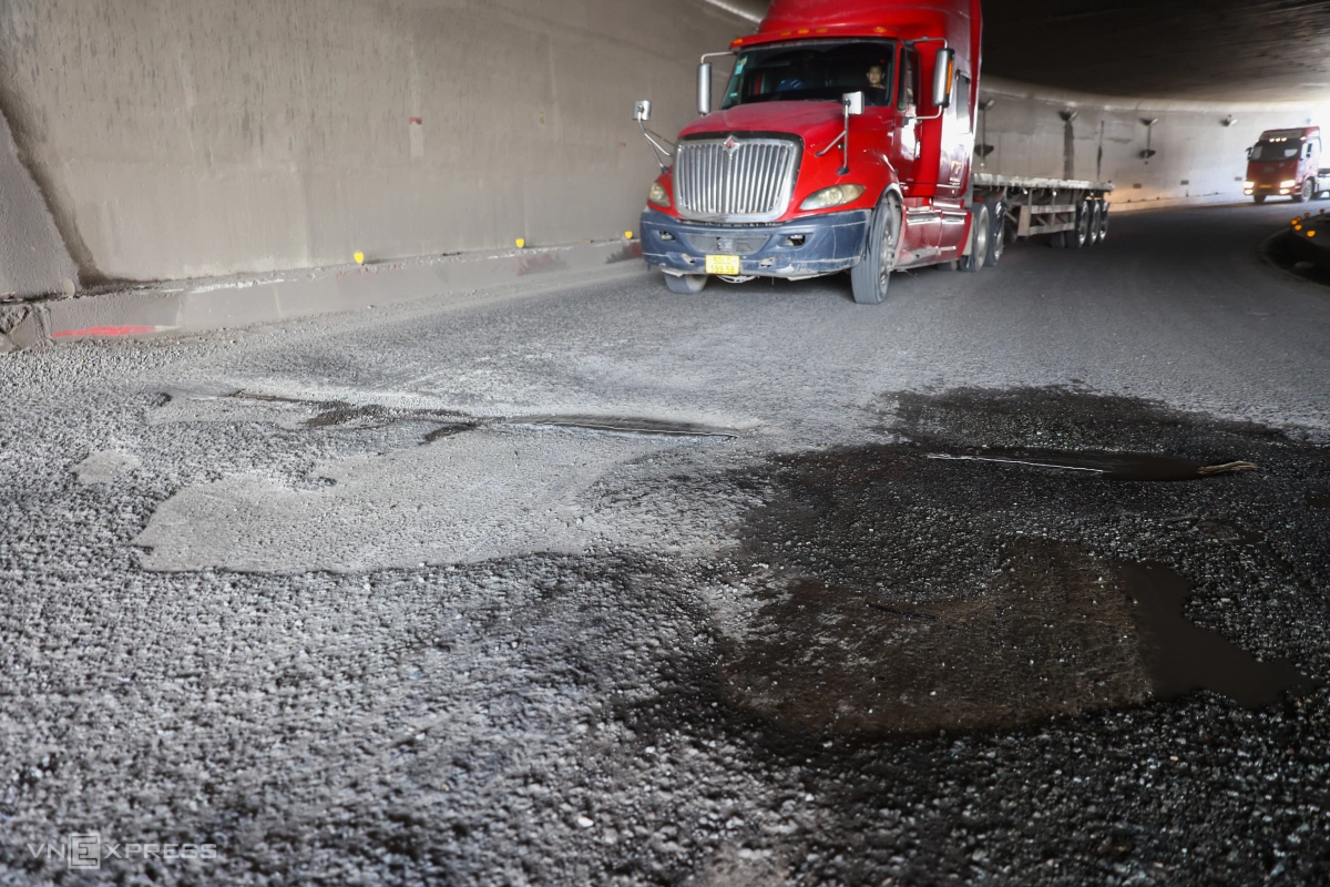 Ngày 17/10, tại hầm chui Mỹ Thủy (phường Cát Lái, TP Thủ Đức cũ), bề mặt đường xuất hiện nhiều ổ gà. Những vết lồi lõm tại thành các hố rộng gần một mét, sâu khoảng 5-10 cm, bào mòn cả gờ giảm tốc.