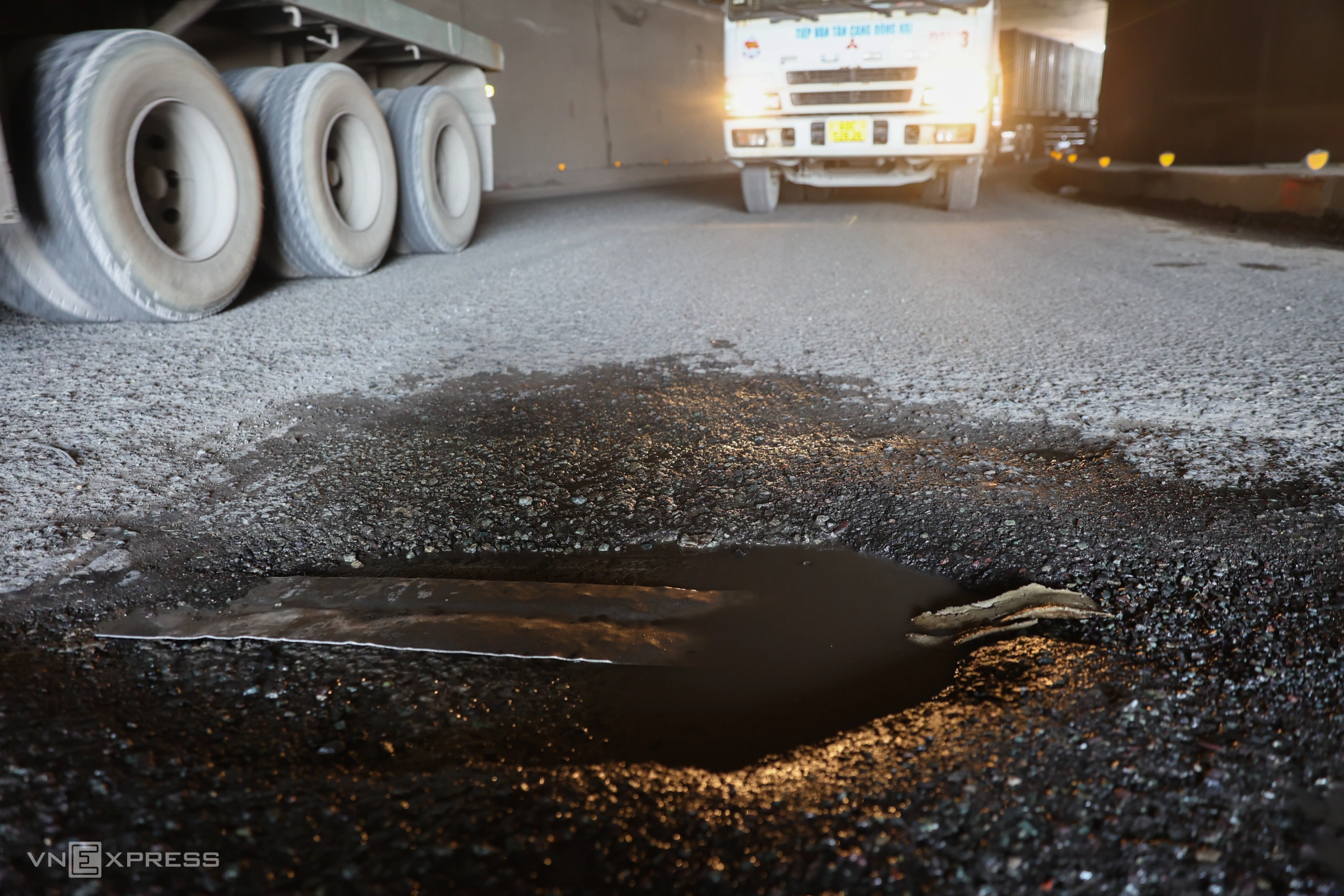 Phần lớn diện tích bề mặt đường trong hầm đã bong tróc thành các vệt lớn không bằng phẳng. Anh Lê Văn An, tài xế container cho biết, tình trạng mặt đường hầm hư hỏng xuất hiện gần nửa năm nay và ngày càng xuống cấp hơn.
