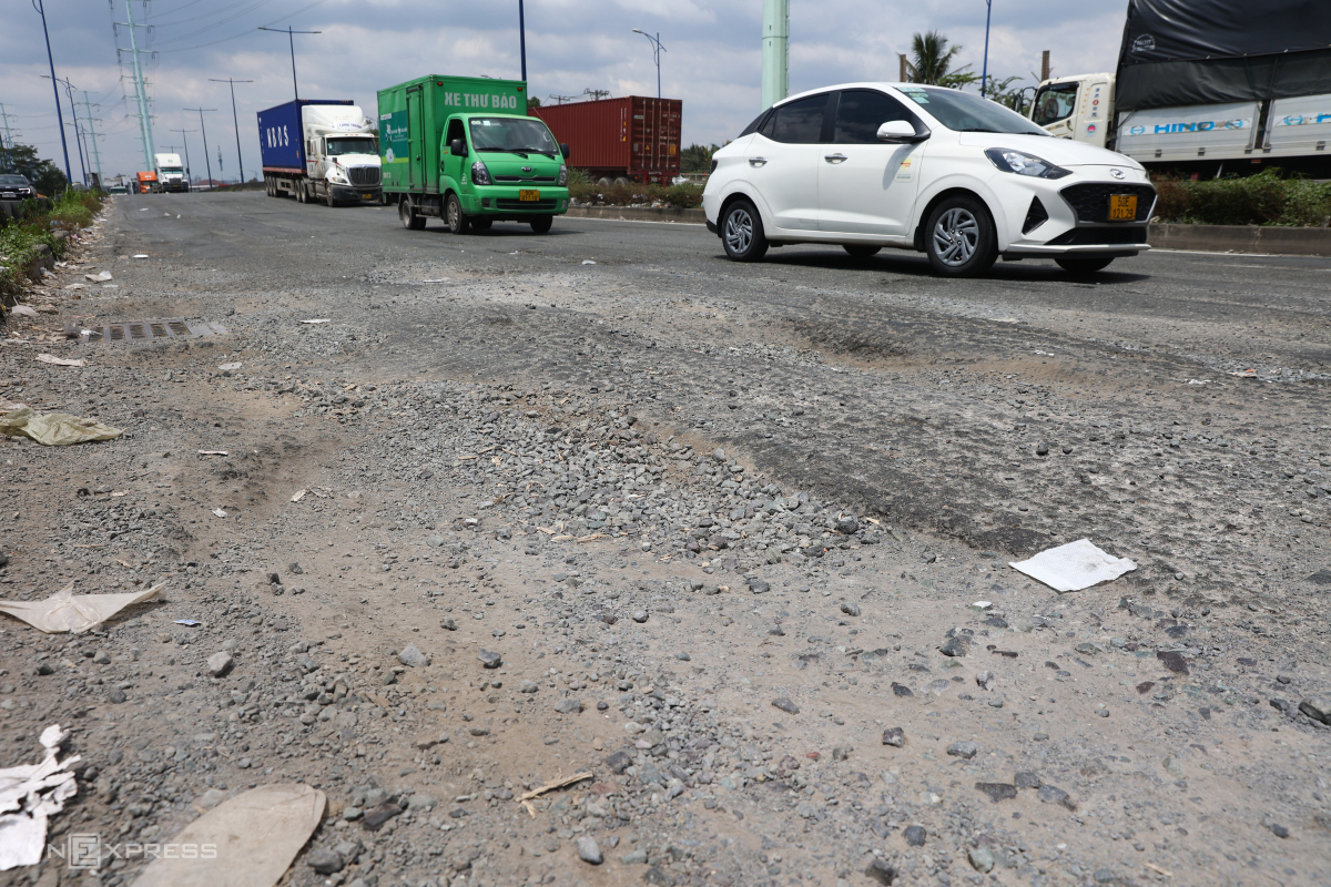 Bế mặt đường với các hố lớn san sát nhau, lớp nhựa bị biến dạng. Nhiều xe phải đi chậm hoặc tránh hẳn sang một bên đường.