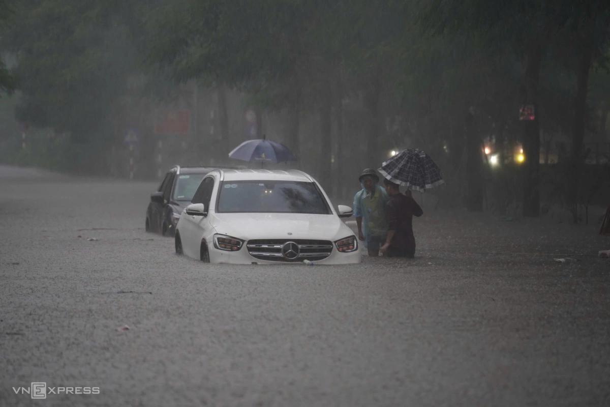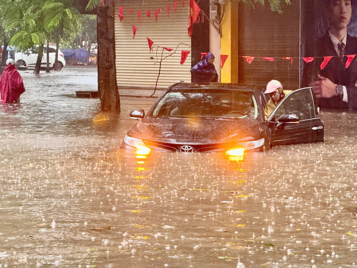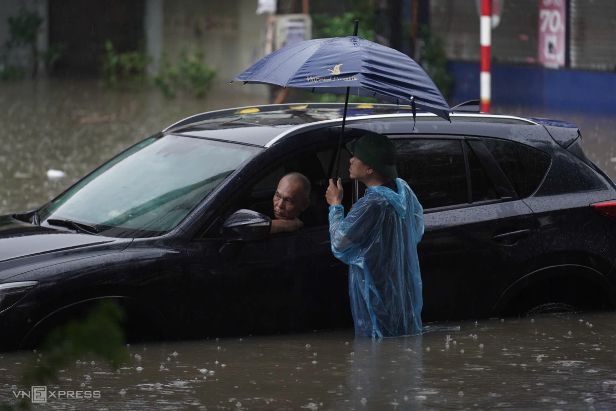Chủ phương tiện đỗ xe qua đêm trên vỉa hè, mưa lớn khiến nước dâng nhanh, ngập đến nửa thân xe. Chủ xe chỉ còn cách di chuyển đồ đạc bên trong và chờ nước rút. Ảnh: Anh Phú