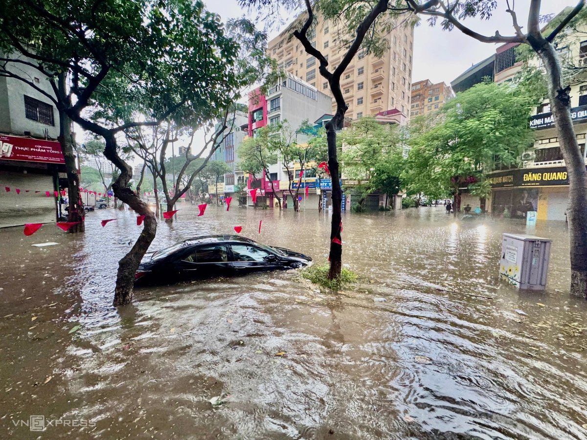 Ngã tư đường Trần Đăng Ninh, phường Cầu Giấy nước dâng cao, có đoạn sâu 60 cm, chiếc ôtô nằm im lìm trong "biển nước" mênh mông. Ảnh: Anh Phú