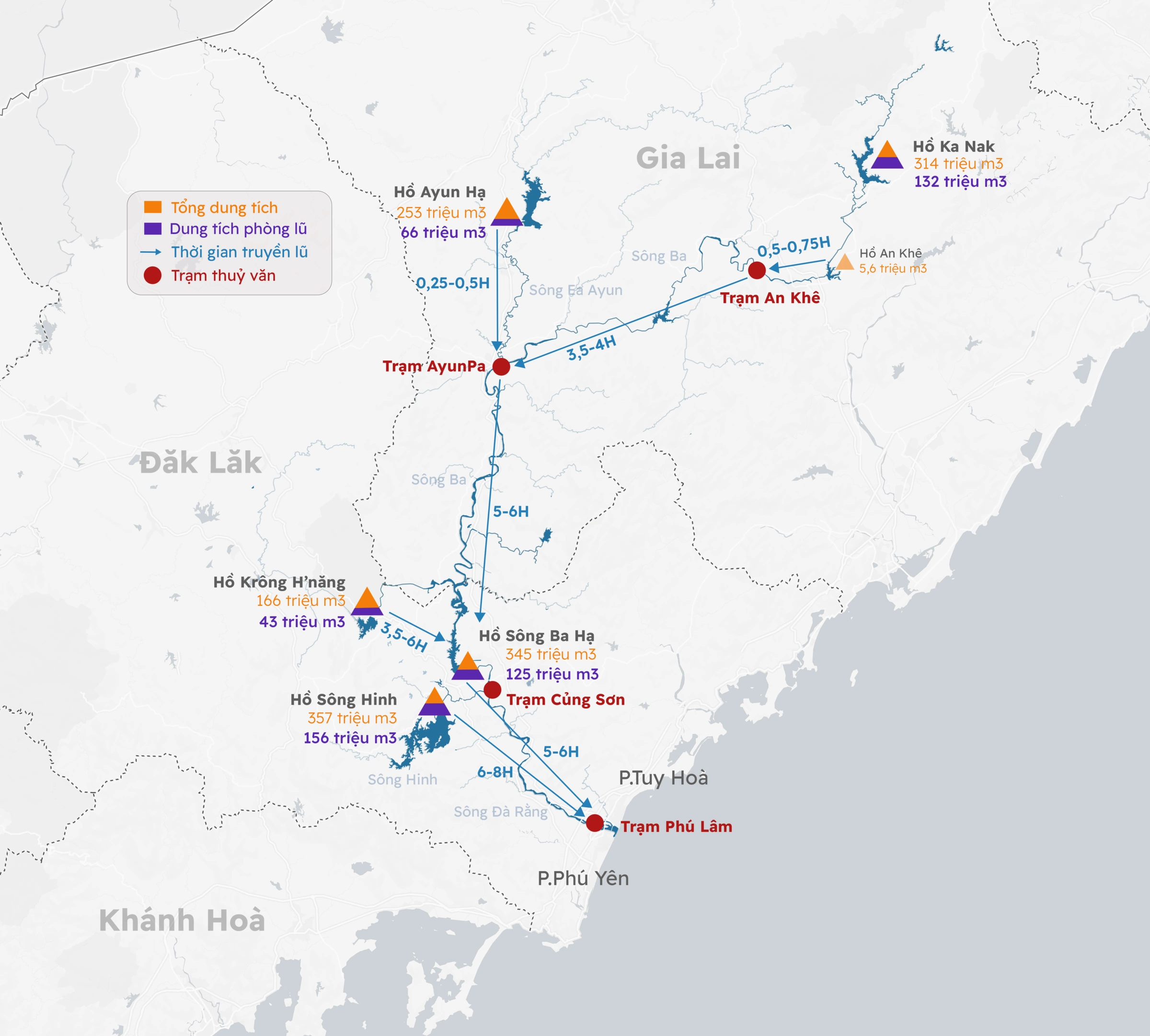 Trên lưu vực sông Ba có 28 hồ chứa lớn nhỏ đi qua hai tỉnh Gia Lai và Đăk Lăk, dung tích khoảng 1,6 tỷ m3, nhưng chỉ 5 hồ có chức năng cắt, giảm lũ cho hạ du gồm: hồ thuỷ điện An Khê - Ka Nak, Krông H’năng, Sông Ba Hạ, Sông Hinh, và hồ thuỷ lợi Ayun Hạ. Tổng dung tích dành cho phòng lũ hạ du của các hồ này là 530 triệu m3.