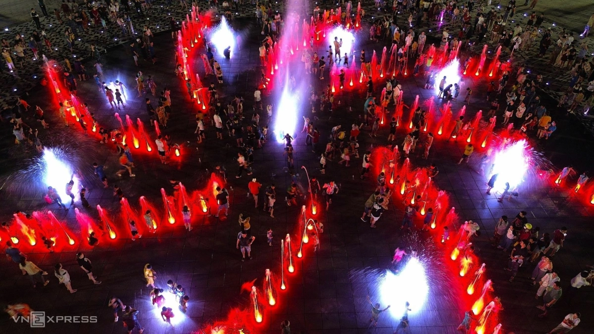 Người lớn, trẻ nhỏ hòa mình cùng nhạc nước tại quảng trường. Hiện hệ thống nhạc nước cùng đèn nghệ thuật đang hoạt động thử nghiệm, bắt đầu từ 19h một số ngày trong tuần.