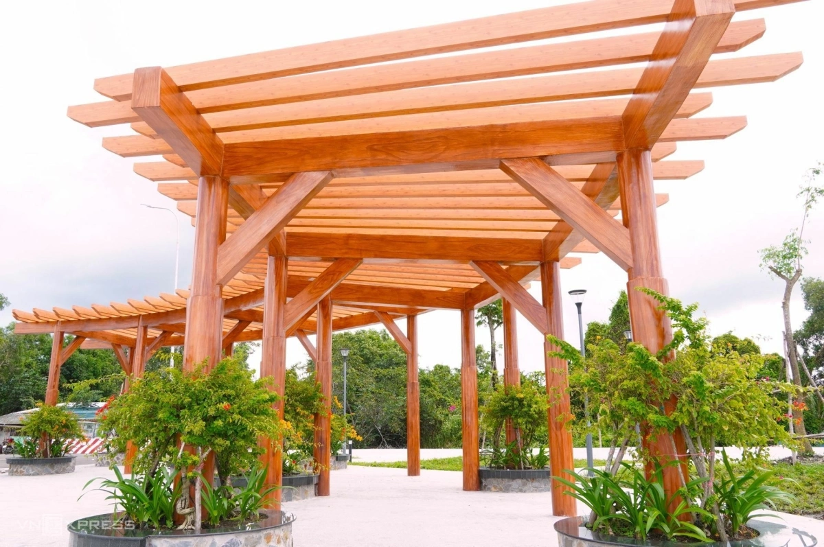 Bên dưới chòi nghỉ là lối đi bộ trong công viên kết hợp với các bồn hoa trồng dây leo xung quanh cột, mặt thành bồn hoa là các chỗ ngồi nghỉ thư giãn.