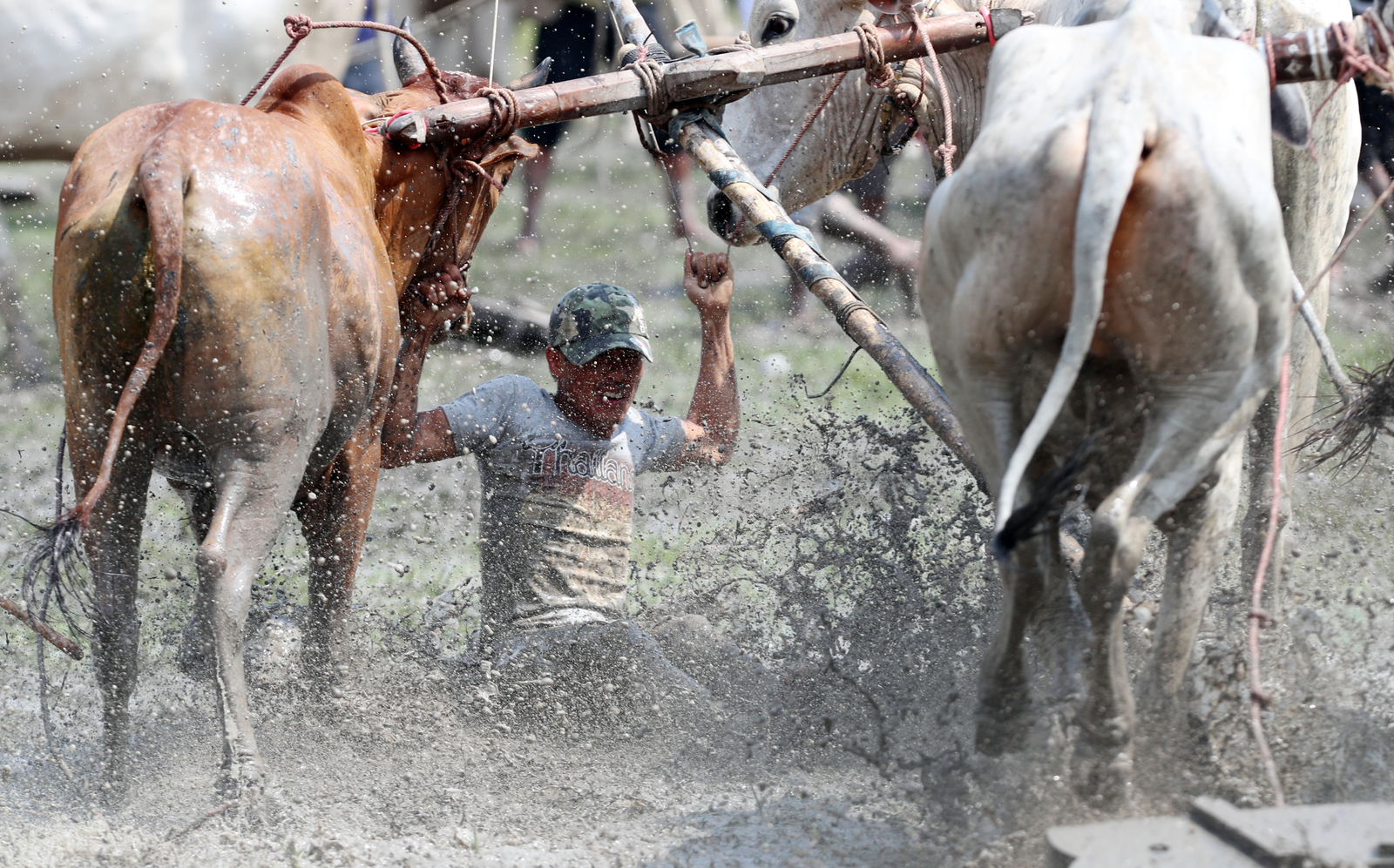 Một "nài" đã bị văng ra khỏi bừa, khiến cặp bò đua chạy lên khán đài làm khán giả hoảng loạn bỏ chạy. Trong trường hợp này, đôi bò nào leo lên bờ trước sẽ bị xử thua.