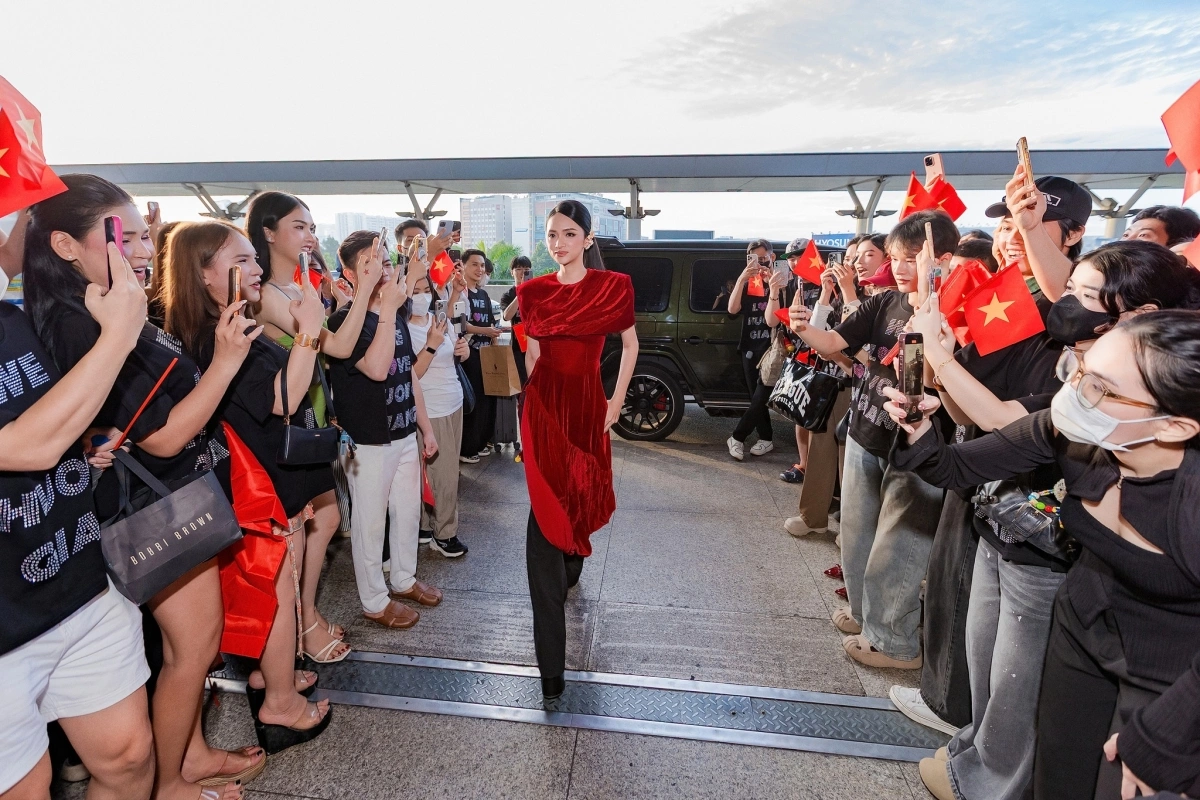 Hương Giang lên đường tham gia cuộc thi hôm 31/10 ngay sau hoạt động ra mắt truyền thông, công chúng trong nước. Hàng trăm fan, bạn bè ra sân bay Tân Sơn Nhất động viên tinh thần cho người đẹp.