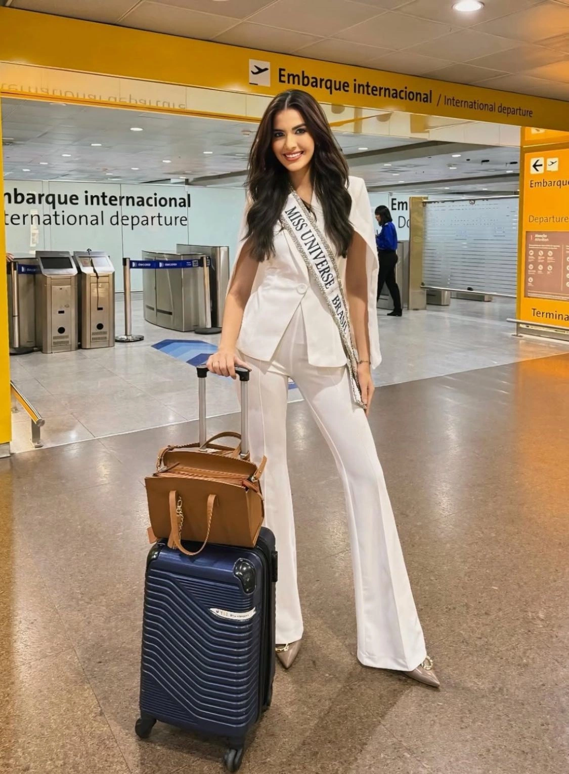 Gabriela Lacerda, người Brazil, mặc vest thanh lịch khi ra sân bay. Cô thuộc nhóm thí sinh tiềm năng của châu Mỹ. Người đẹp 21 tuổi, cao 1,78 m, là sinh viên ngành báo chí. Cô từng đoạt á hậu 1 tại Hoa hậu Hoàn vũ Brazil 2021.