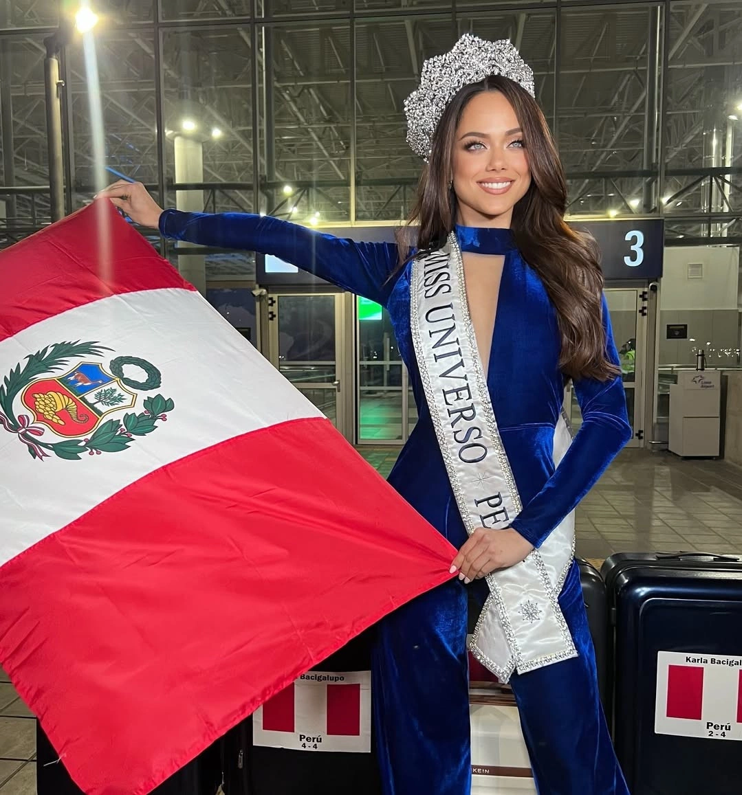 Karla Bacigalupo, người Peru, nổi bật ở sân bay với trang phục và chiếc vương miện. Cô 34 tuổi, hiện làm người mẫu, diễn viên. Karla có bằng chuyên ngành Quản trị kinh doanh và Quản lý tại Đại học Lima, Peru. Cô còn tham gia nhiều bộ phim truyền hình và điện ảnh tại Mỹ. Năm 2022, cô góp mặt trong phim ngắn giả tưởng The Devil, do Marie Rouhban đạo diễn. Người đẹp từng đóng chung dự án cùng các diễn viên Ilca Andrade, Nick Bardin, David Blindauer.