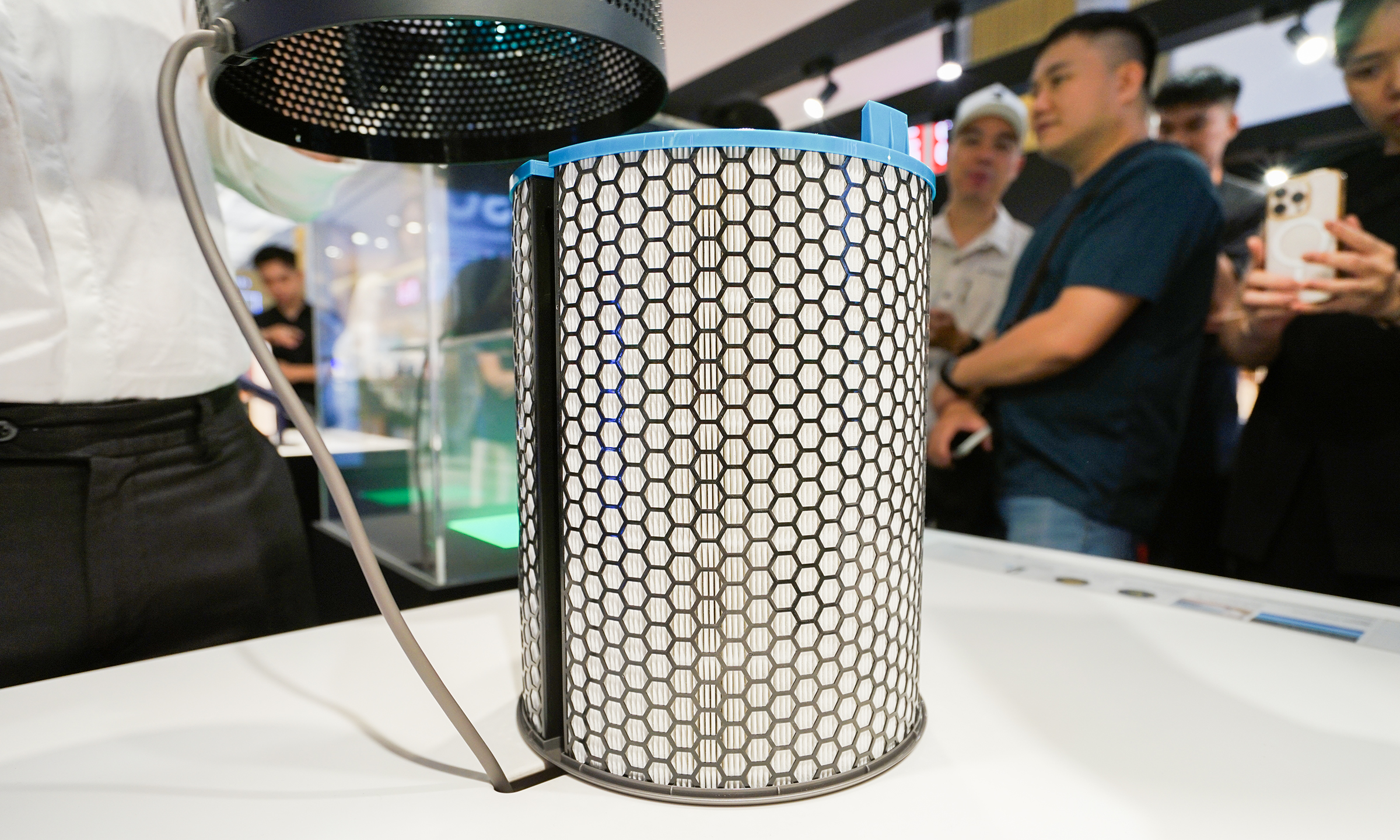Phần lớn diện tích của máy lọc được đục lỗ để hút không khí từ mọi hướng. Hai khóa được ẩn sâu hai bên thân, giúp tháo lắp, thay mới bộ lọc nhanh chóng nhưng vẫn đảm bảo thiết kế liền mạch. Tuy vậy, bề mặt này cũng dễ bám bụi trong quá trình sử dụng, đòi hỏi người dùng cần vệ sinh thường xuyên.