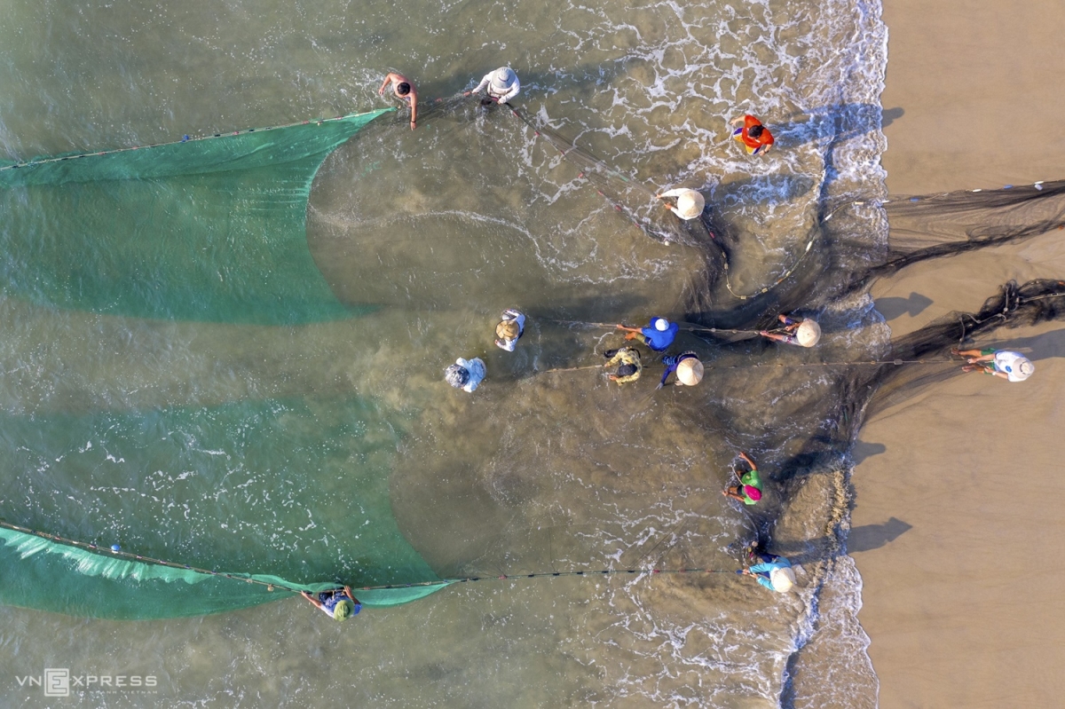 Những ngư dân, chủ yếu là đàn ông căng mình kéo lưới với đôi bàn tay thoăn thoắt và những bước chân chịu lực trên các làn sóng dạt vào bờ.