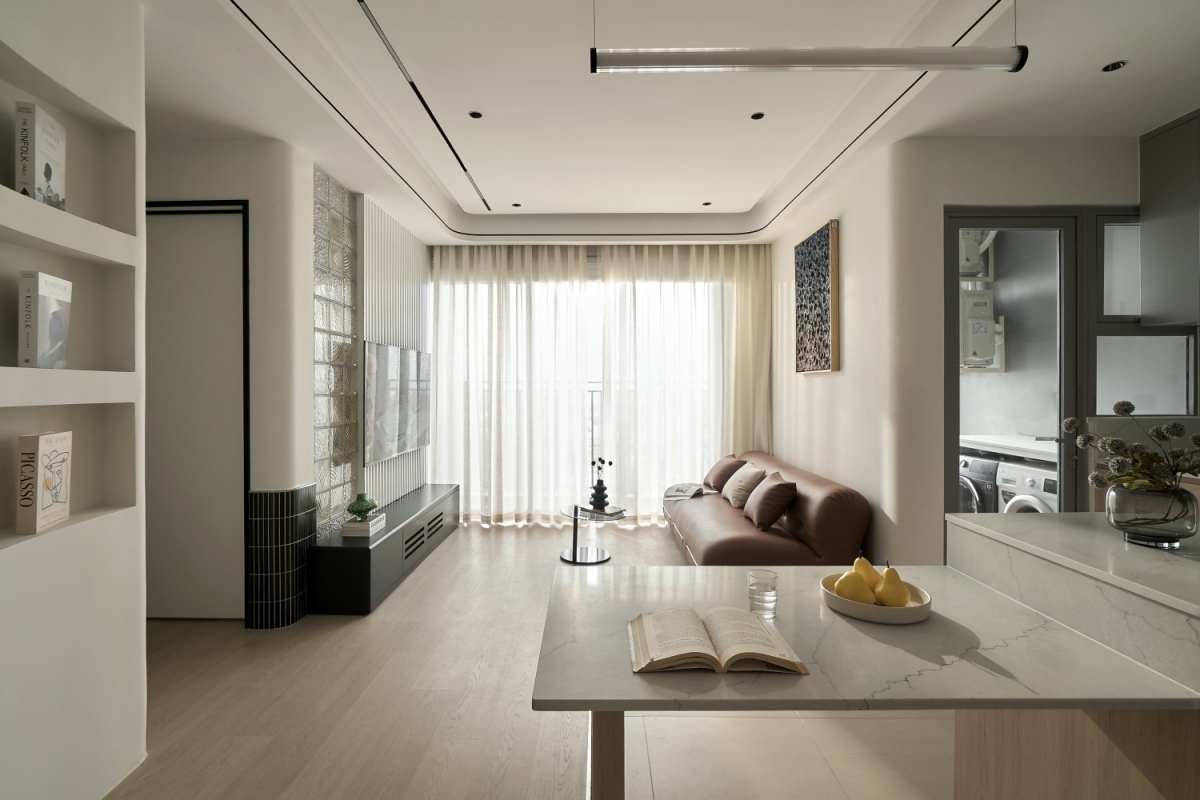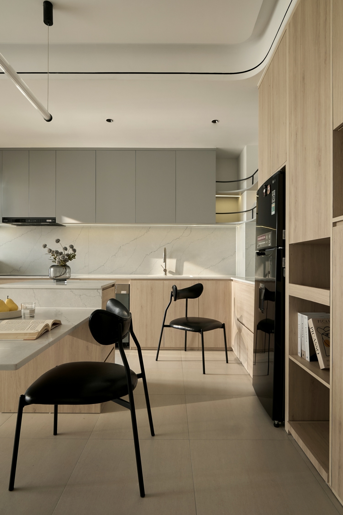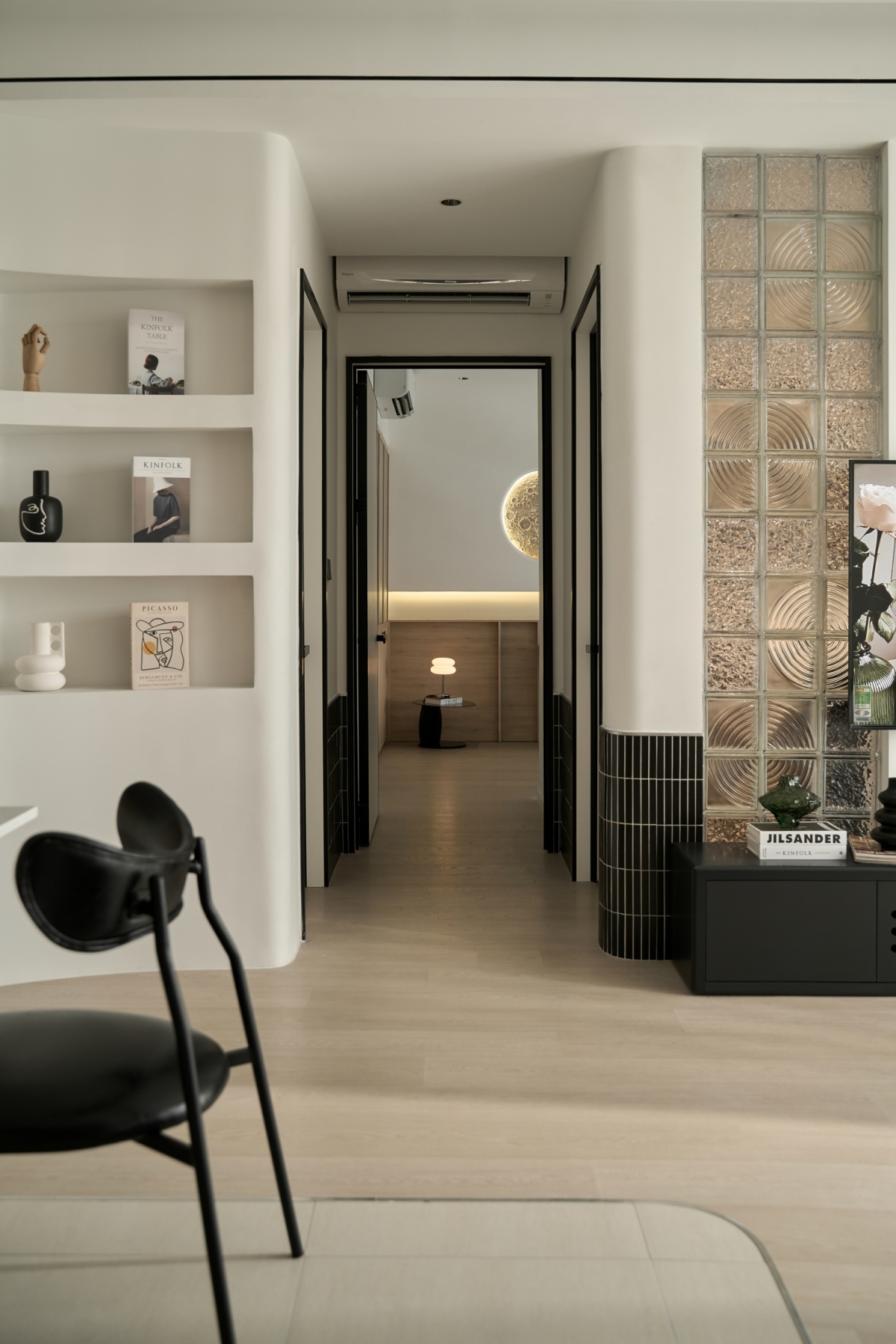 Căn hộ được tổ chức lại công năng với 2 phòng ngủ, 2 vệ sinh, bếp và phòng khách liên thông. Nhờ cách bố trí và sử dụng vật liệu linh hoạt, không gian có sự tách biệt vừa đủ, duy trì sự thông suốt trong sinh hoạt hàng ngày.