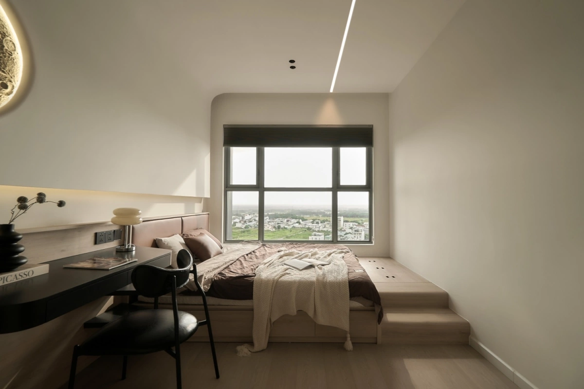 Phòng ngủ master sử dụng giường nâng kết hợp bậc gỗ và bàn làm việc liền tường, tận dụng ánh sáng tự nhiên từ cửa sổ lớn.