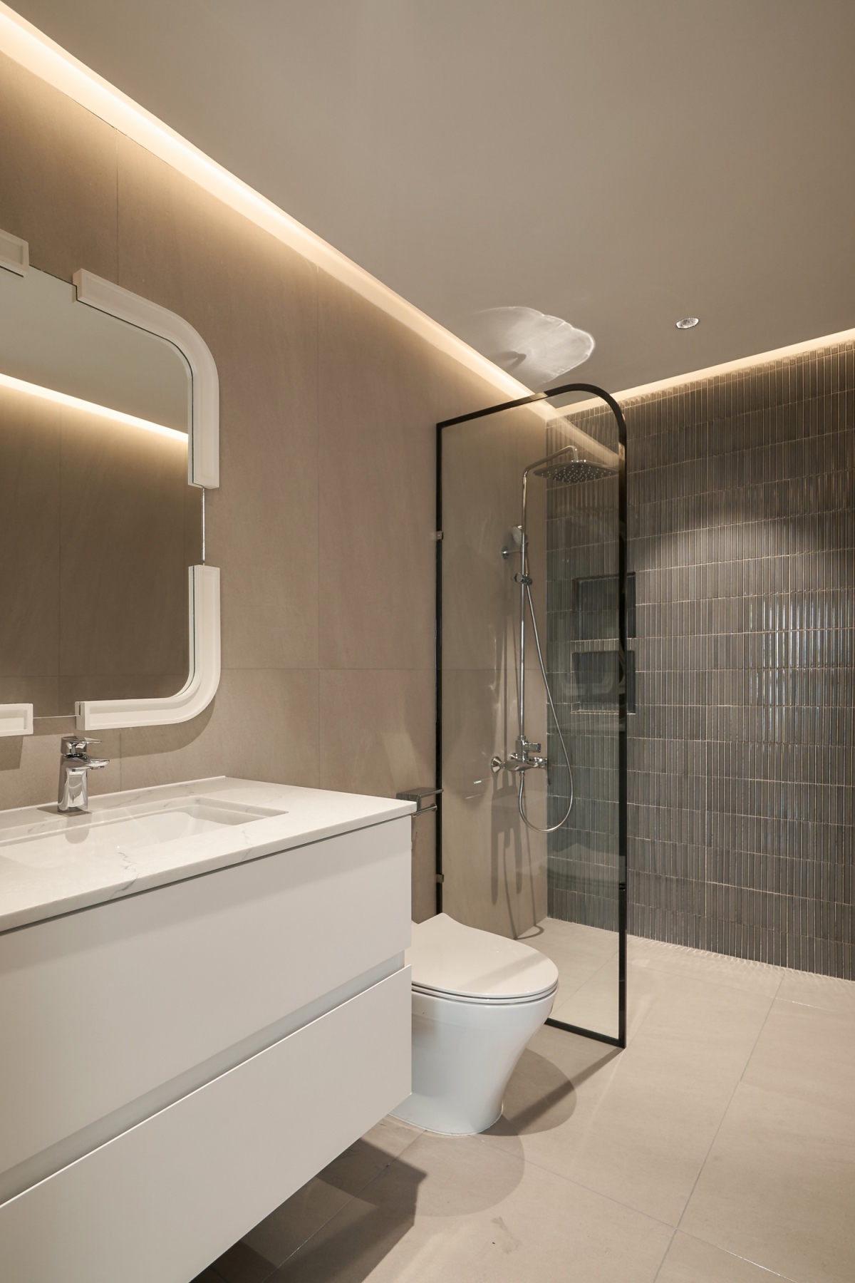 Phòng tắm với gam màu trung tính kết hợp ánh sáng hắt trần, vách kính trong suốt giúp không gian thoáng và gọn gàng.