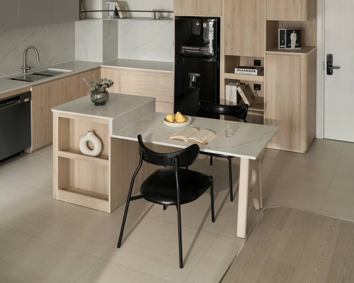 Bếp bố trí sát cửa ra vào, kết hợp đảo bếp và bàn ăn, phân tách khu vực bằng gạch sàn, tạo ranh giới nhẹ giữa bếp và phòng khách.