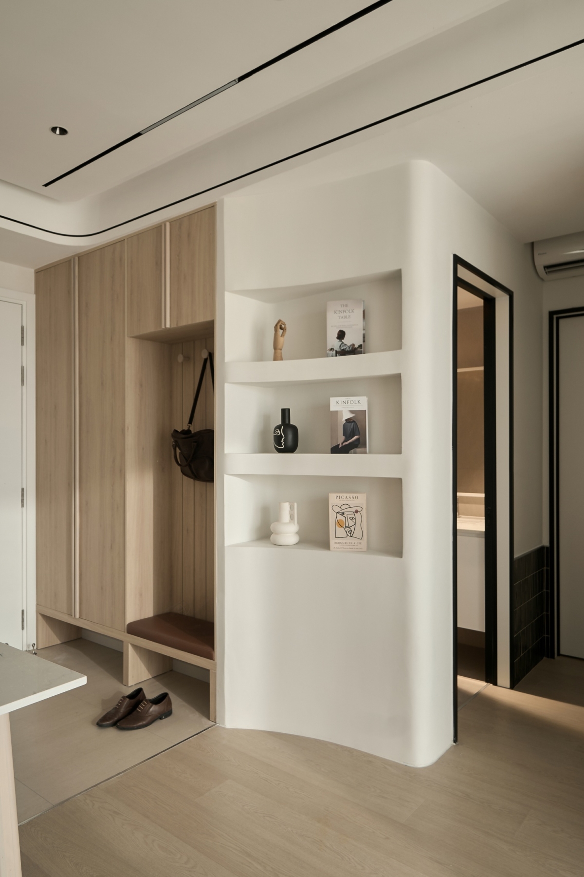 Hệ tủ gỗ tích hợp ghế ngồi và kệ âm tường bo cong tại sảnh vào, tăng diện tích lưu trữ và tạo cảm giác liền mạch cho không gian.