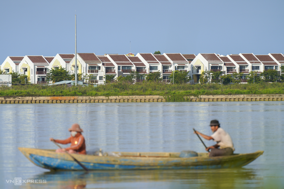 Người dân địa phương chèo thuyền đánh cá qua khu vực dự án. "Dự án bỏ hoang đã lâu, chúng tôi là người dân địa phương cũng mong dự án sinh thái sớm hoạt động để phát triển du lịch và khu vực này nhộn nhịp hơn", ông Khánh, trú Cẩm Kim, nói.