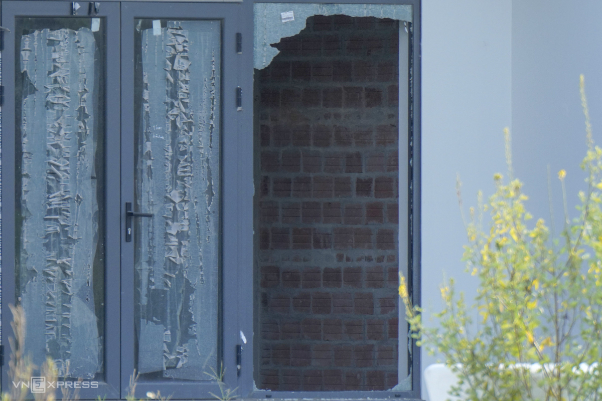 Bên trong cửa kính vỡ lộ ra bức tường gạch thô, cho thấy nhiều căn shophouse chưa hoàn thiện bàn giao cho khách.