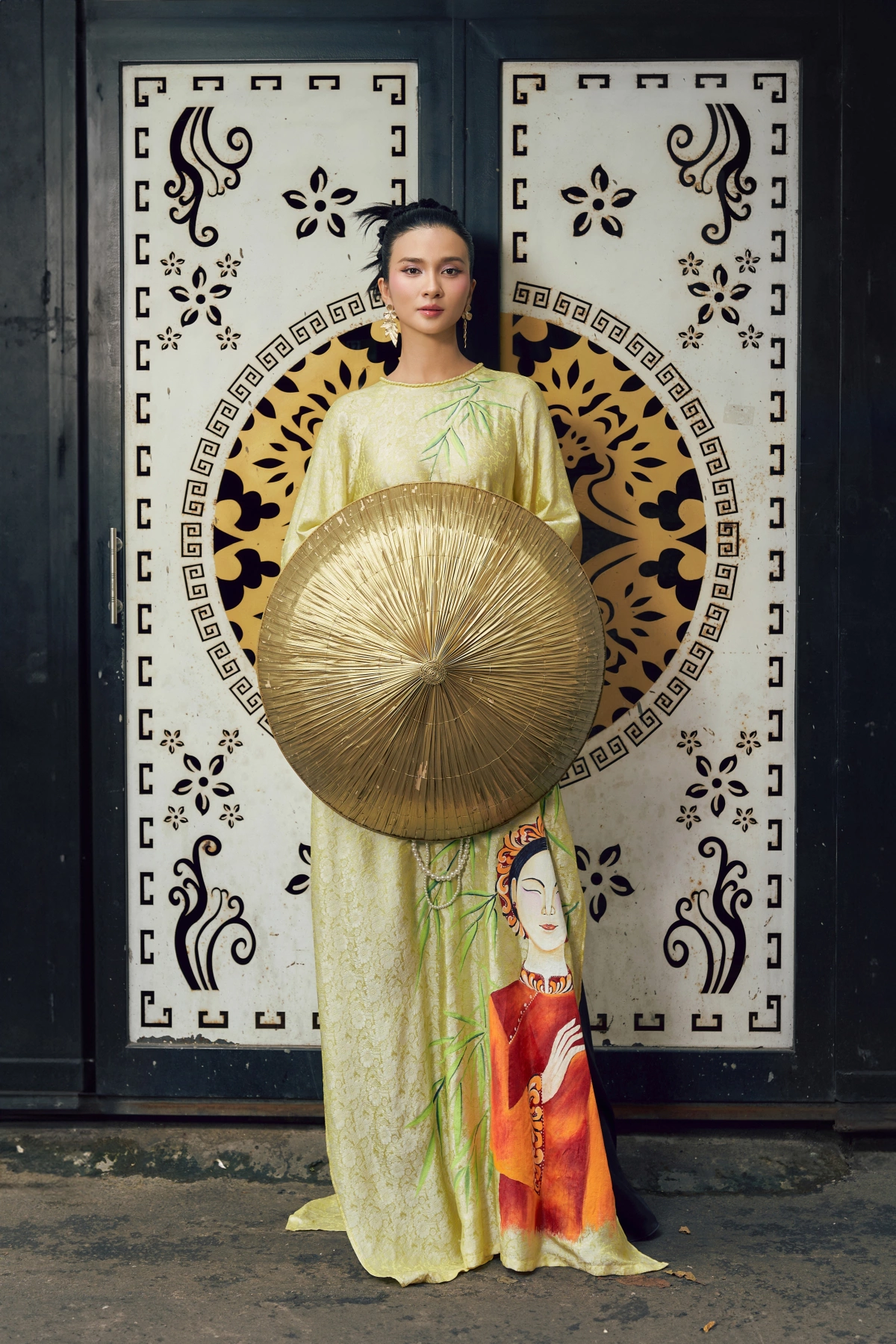 Diễn viên thể hiện mẫu áo dài truyền thống cùng mô hình chiếc đèn lồng khổng lồ.
