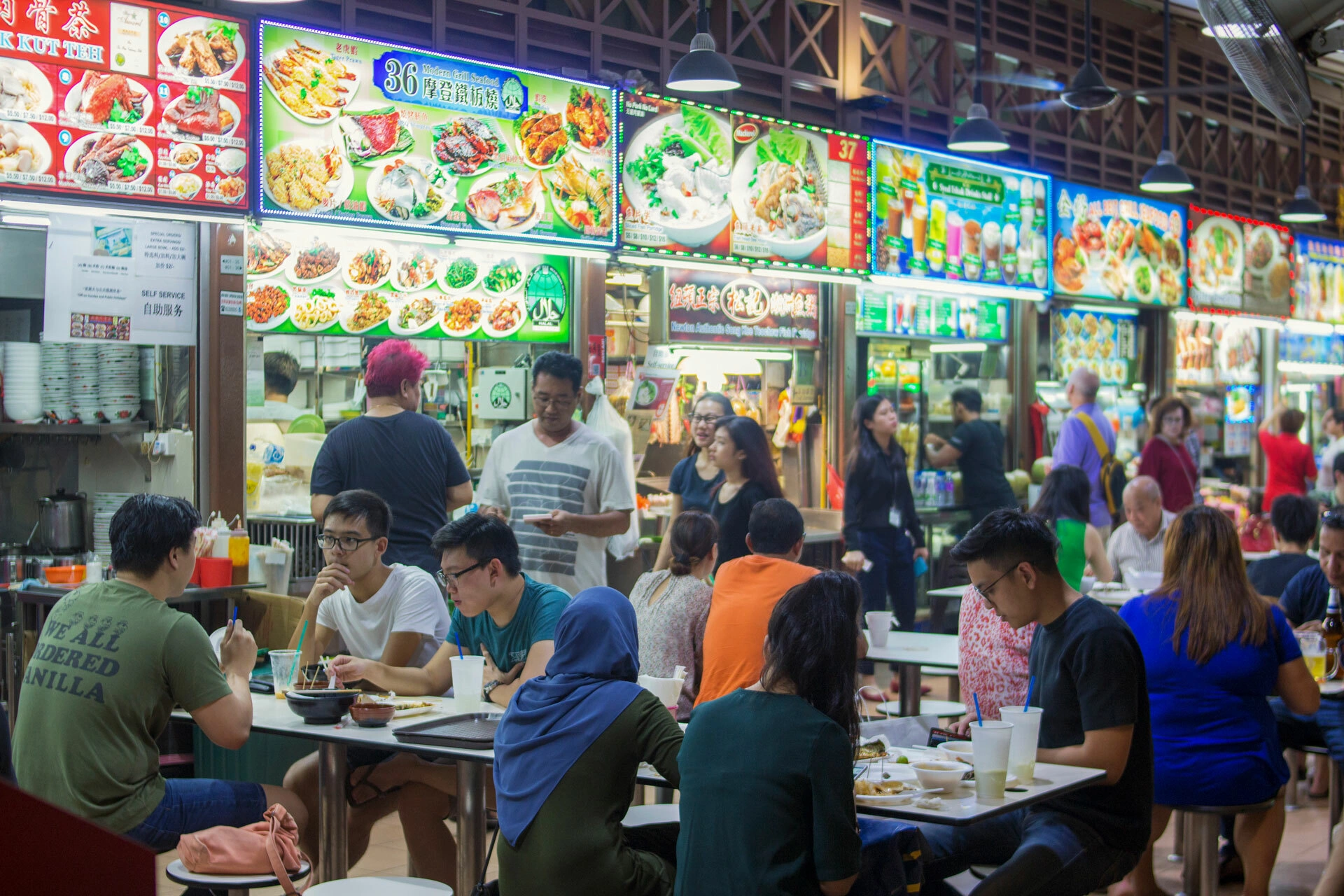 Hầu hết trung tâm thương mại đều có khu bán đồ ăn. Tuy nhiên nếu muốn tiết kiệm tiền để mua sắm, bạn có thể ăn uống tại các food court nổi tiếng như Chomp Chomp, Golden Mile, Lau Pa Sat... đồ ăn phong phú và rẻ hơn khá nhiều so với nhà hàng.