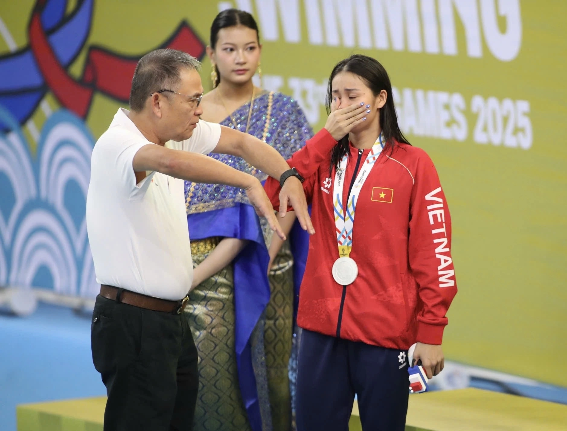 Mỹ Tiên nén xúc động rồi di chuyển nhanh vào khu vực dành cho VĐV, trước khi lên xe cùng đội tuyển bơi về khách sạn.
