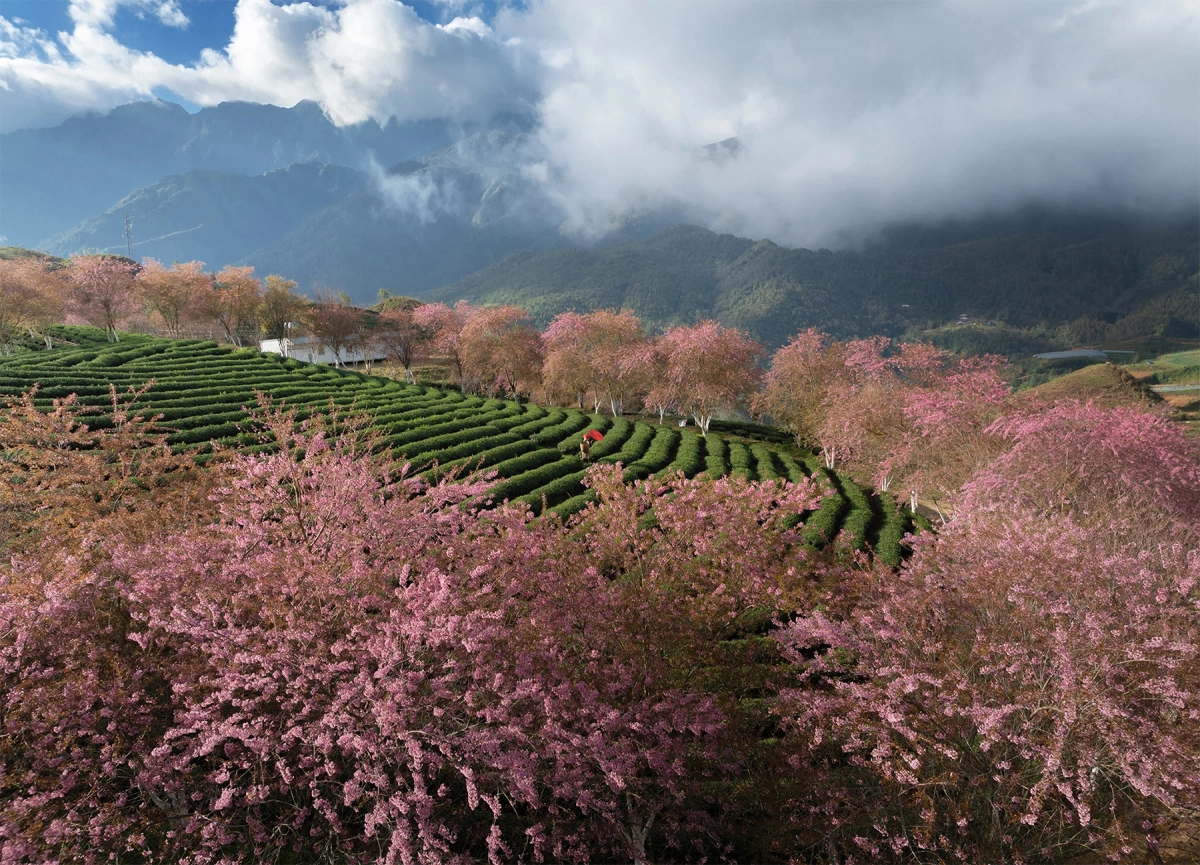 Giữa tháng 12, du khách đi dọc quốc lộ 4C hướng từ đèo Ô Quý Hồ về trung tâm Sa Pa sẽ gặp hàng nghìn cây mai anh đào bung nở rực giữa đồi chè xanh.