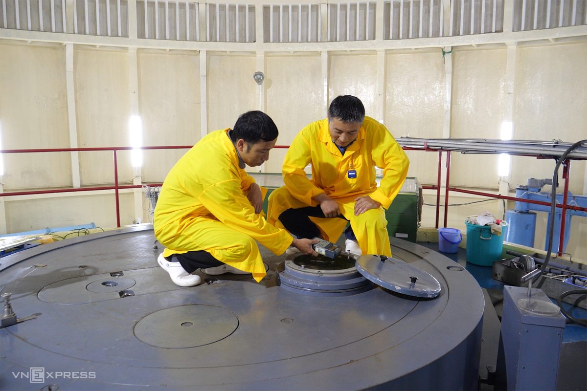 Nhân viên Viện nghiên cứu hạt nhân đo nồng độ phóng xạ ở miệng lò phản ứng.