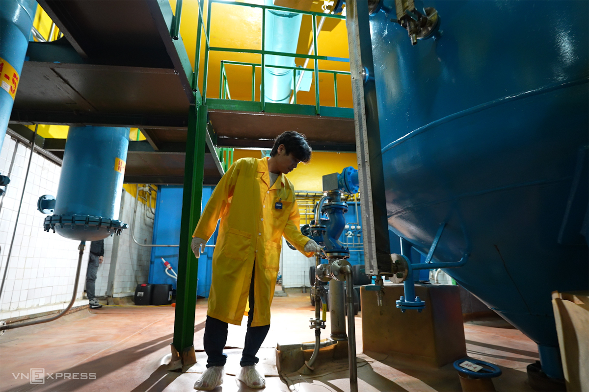 Nam nhân viên kiểm tra hệ thống xử lý nước ở lò phản ứng.