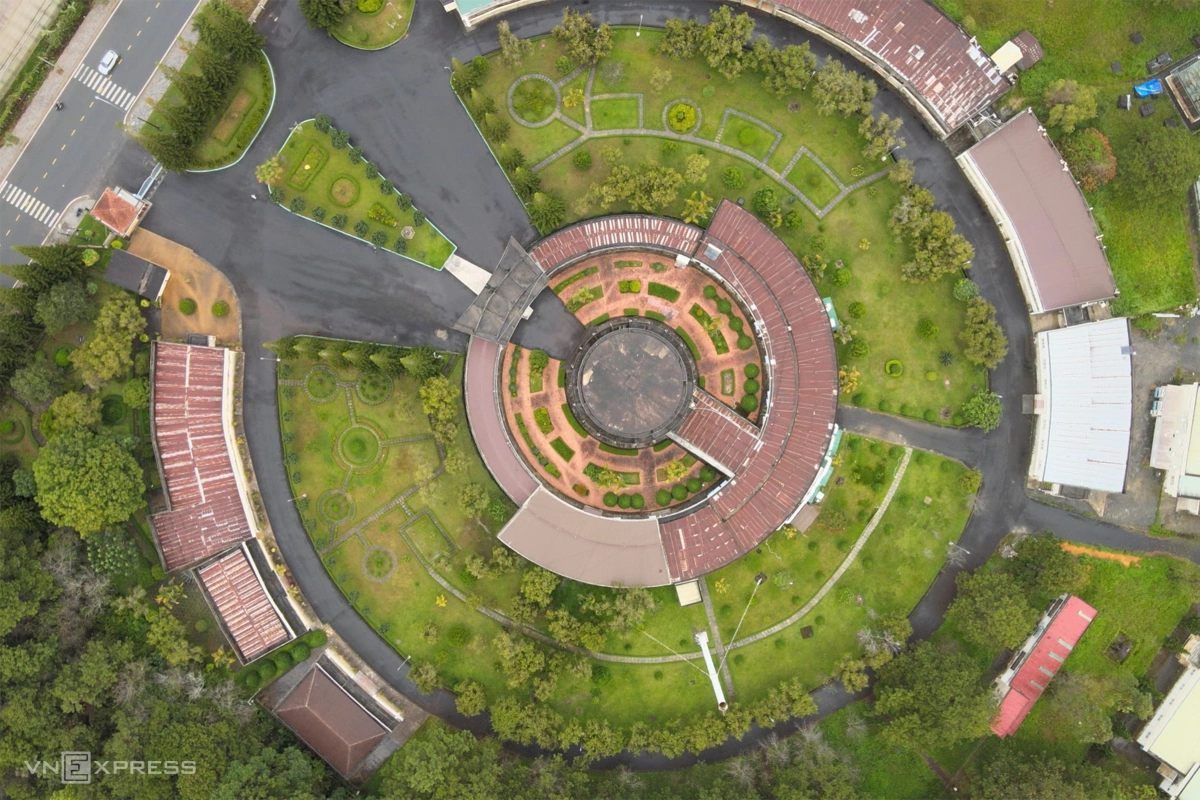 Từ trên cao, công trình nổi bật với khối nhà chính hình tròn ở trung tâm -nơi đặt lò phản ứng, bao quanh là các dãy nhà bán nguyệt và đường nội bộ uốn cong kết nối các khu chức năng.