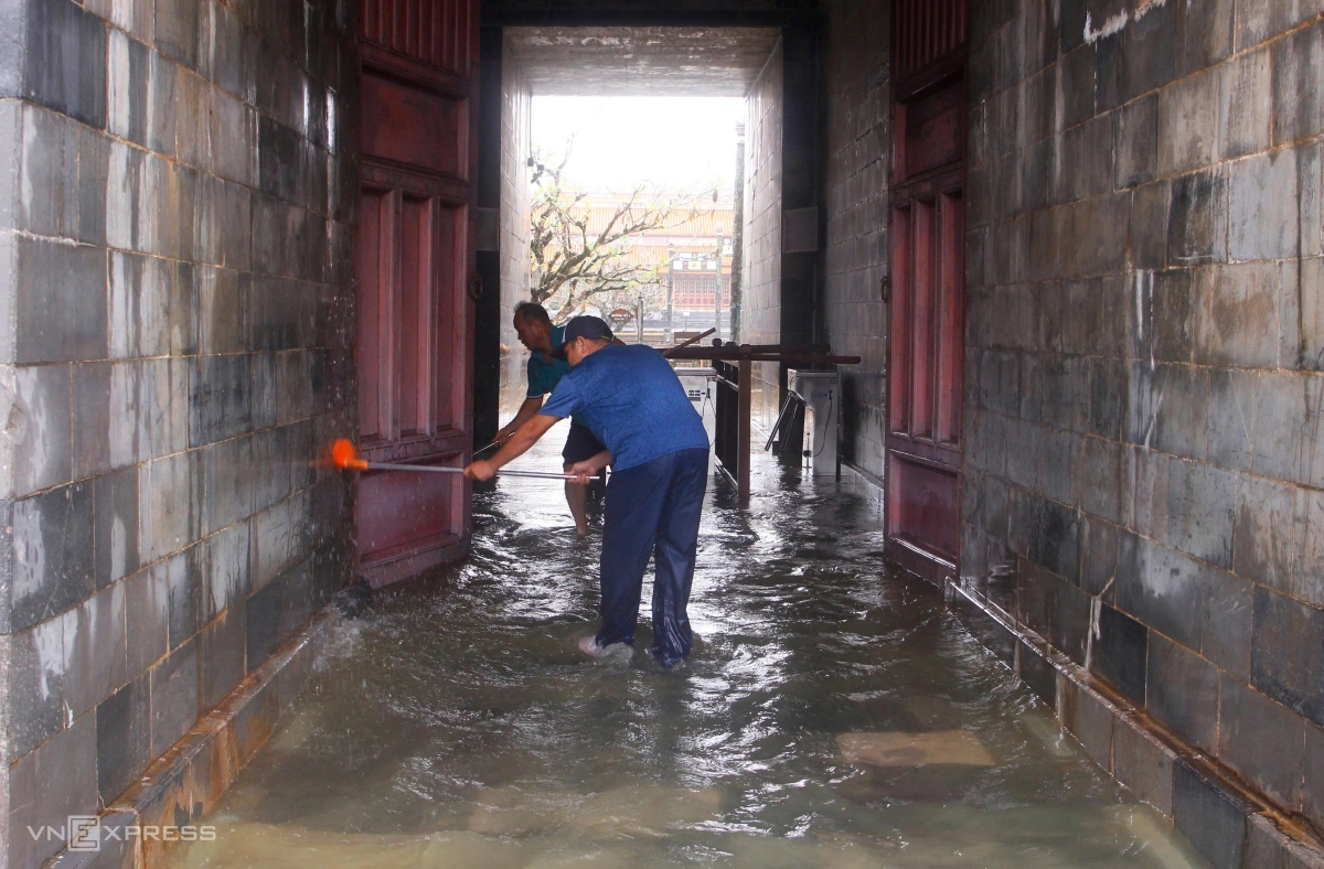 Nằm bên sông Hương, Đại nội Huế - khu vực bên trong kinh thành Huế, có chức năng bảo vệ các cung điện quan trọng, miếu thờ và Tử Cấm thành, vẫn đang ngập.