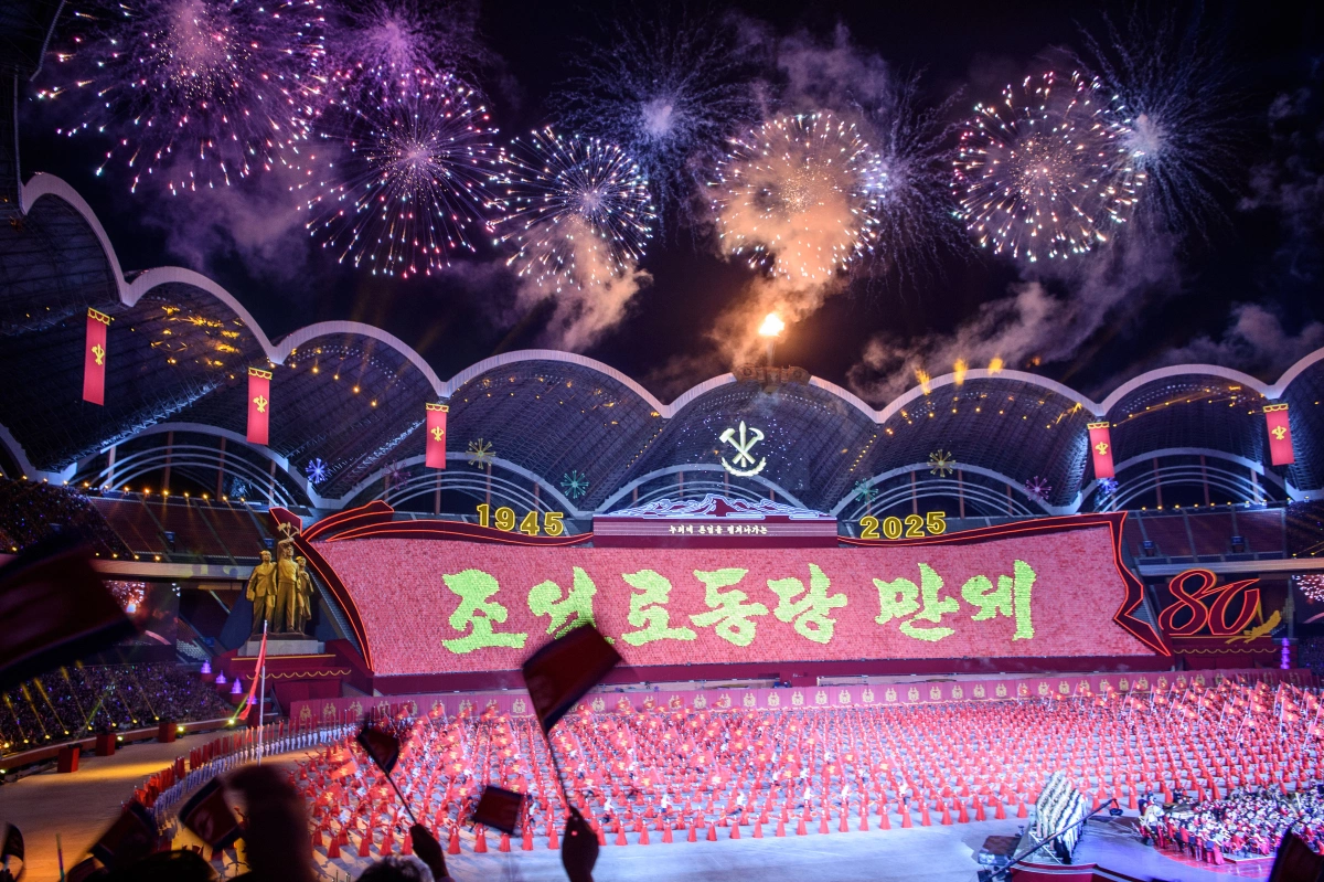 Pháo hoa rực sáng trên sân vận động mùng 1 tháng 5 Rungrado, trên khán đài xếp dòng chữ "Đảng Lao động Triều Tiên muôn năm".