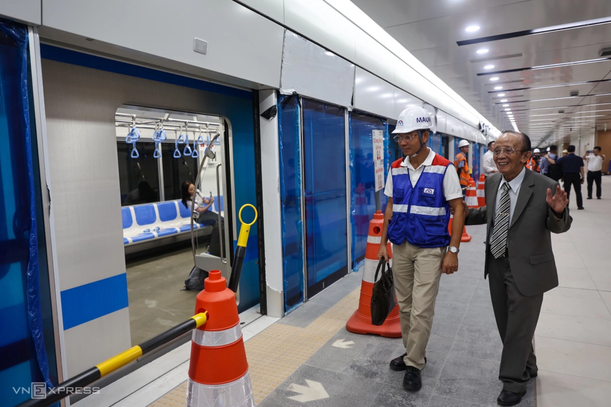 Ông Hà Ngọc Trường, 84 tuổi, cán bộ về hưu cùng các kỹ sư, khách tham tham quan nhà ga Nhà hát thành phố.