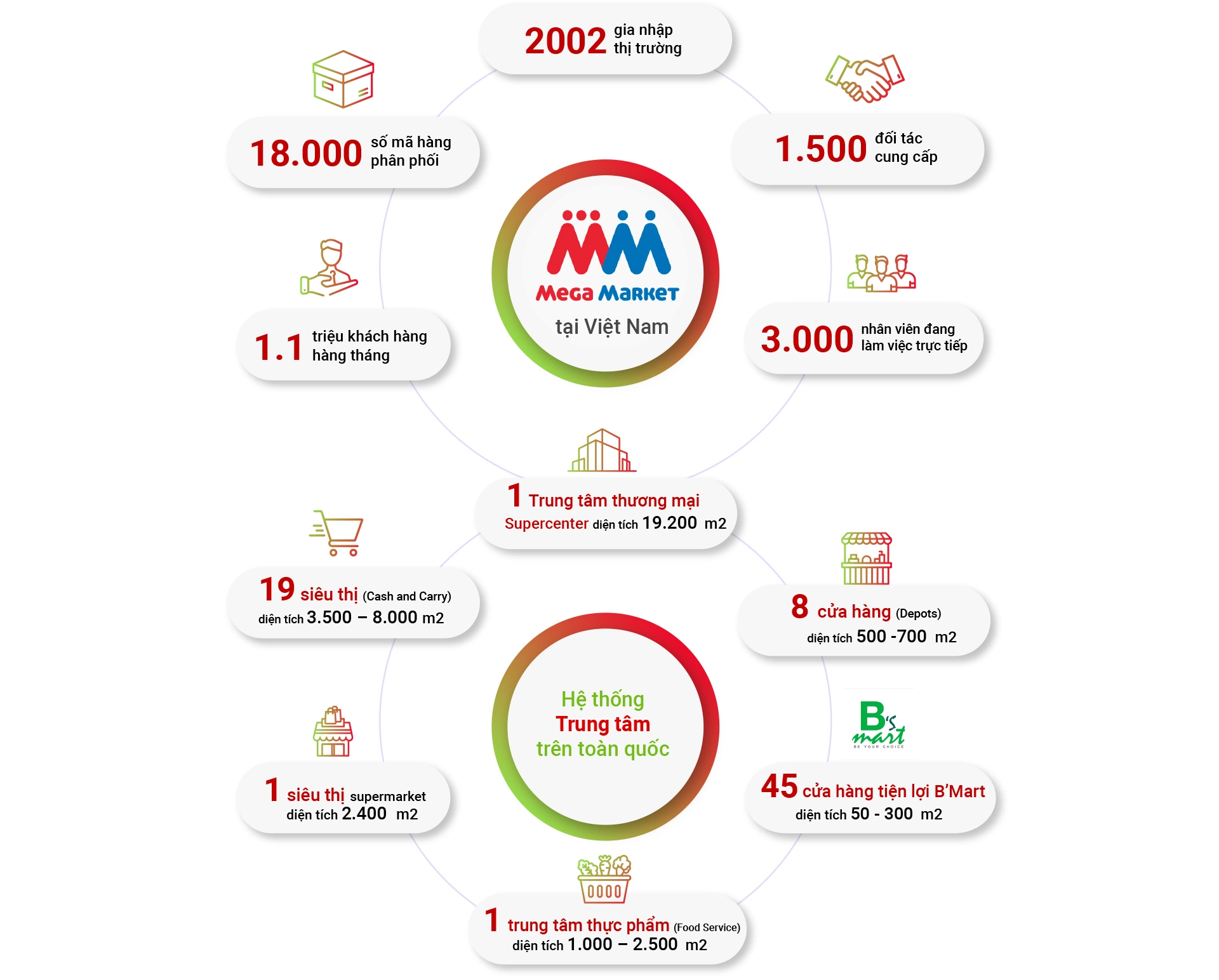 - Từ cửa hàng đầu tiên tại TP HCM năm 2002, MMVN đã xây dựng mạng lưới hơn 20 trung tâm trên toàn quốc, phục vụ hàng triệu khách hàng doanh nghiệp và hộ gia đình. Sức mạnh của chúng tôi nằm ở chuỗi cung ứng khép kín "từ nông trại đến bàn ăn" - nền tảng được đầu tư bài bản suốt nhiều năm qua.